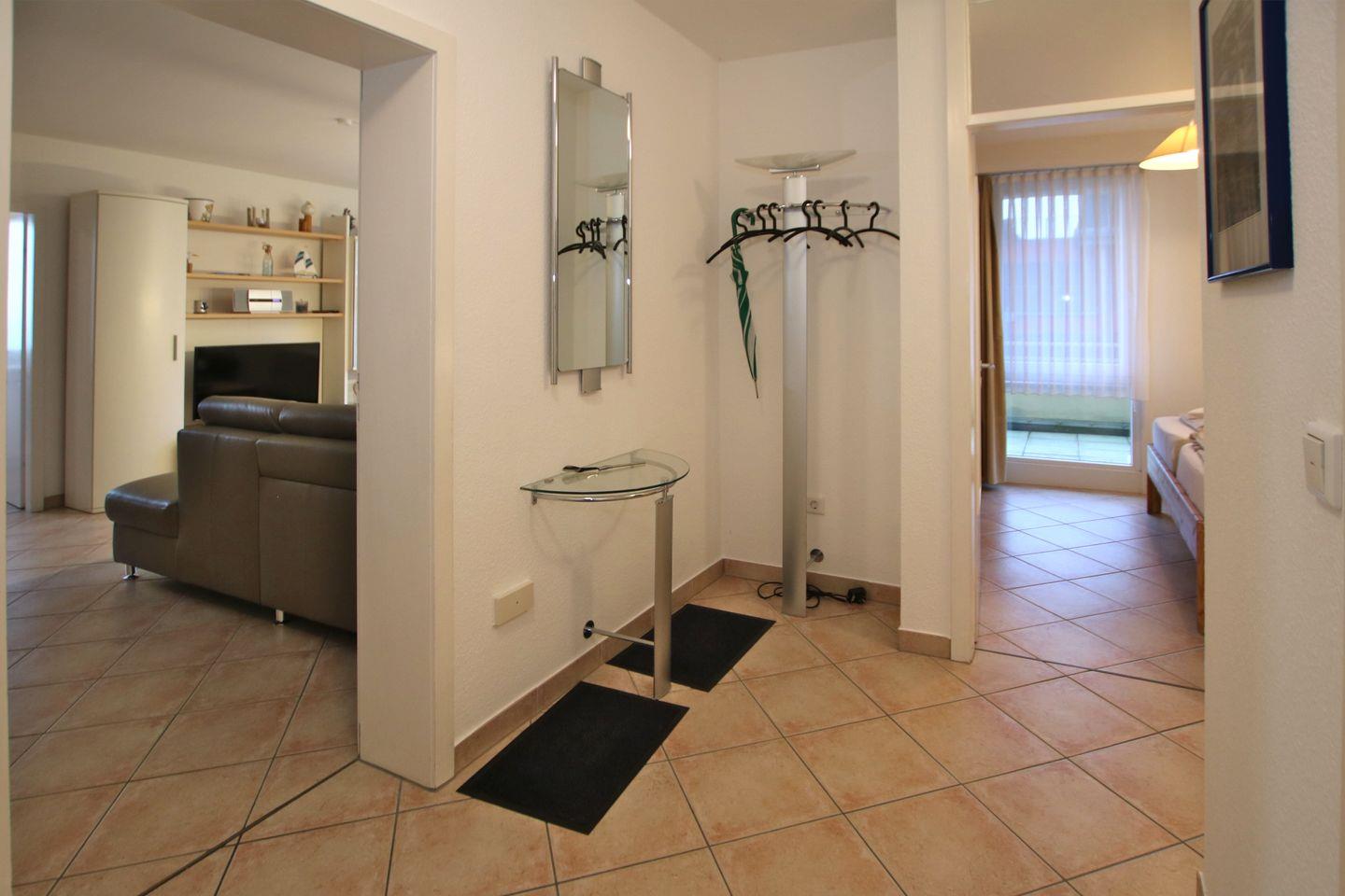 WOHNZIMMER: Ledercouchen 2 er und 3 er, Sessel mit Couchtisch und Kleiderschrank. KÜCHE: Einbauküche mit allen Extras, Eßplatz mit Eckbank und 3 Stühlen. SCHLAFZIMMER 1: Doppelbett (1,80x2m) und Kleiderschrank. SCHLAFZIMMER 2: Doppelbett (1,40x2m) und 1 Einzelbett (0,90x2m). BAD: Dusche/WC. Die Wohnung ist komplett mit Fliesen ausgelegt. Parkplatz ist nicht am Haus, es kann aber am Wellenbad geparkt werden. Fahrstuhl im Haus. Das Haus ist vorne und vom Parkplatz aus nur über Treppenstufen zu erreichen. Nachtspeicherheizung. Waschmaschine in der Küche, Balkonmöbel, Allergikergerechte Ausstattung, Belegung mit 5 Personen nur mit max. 4 Erwachsenen.