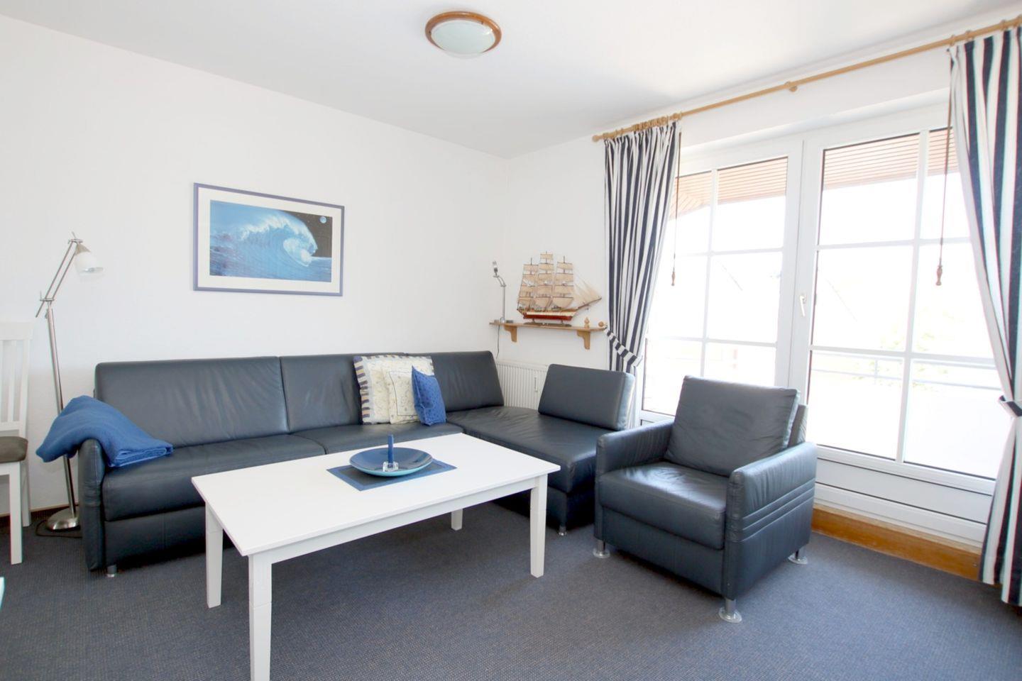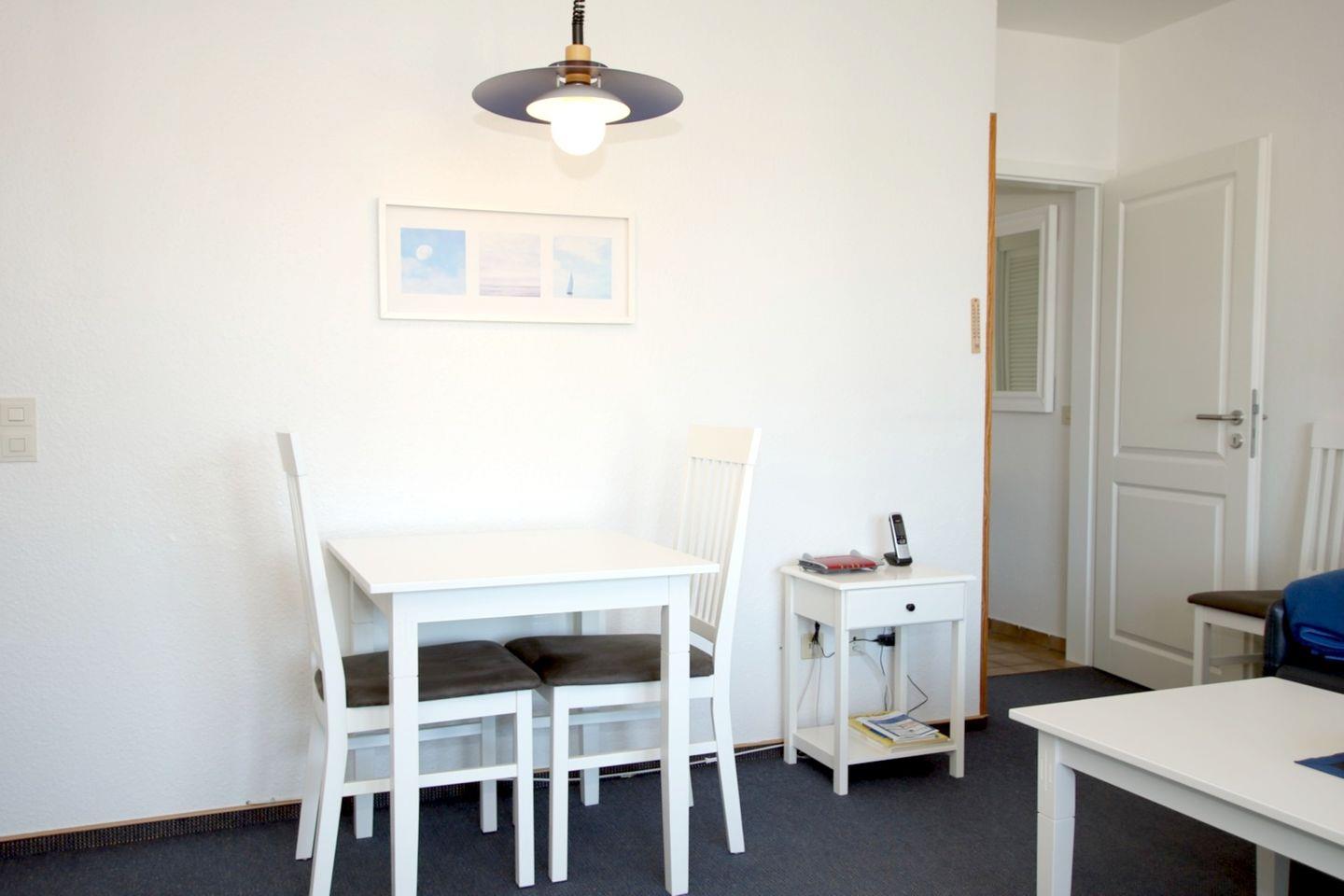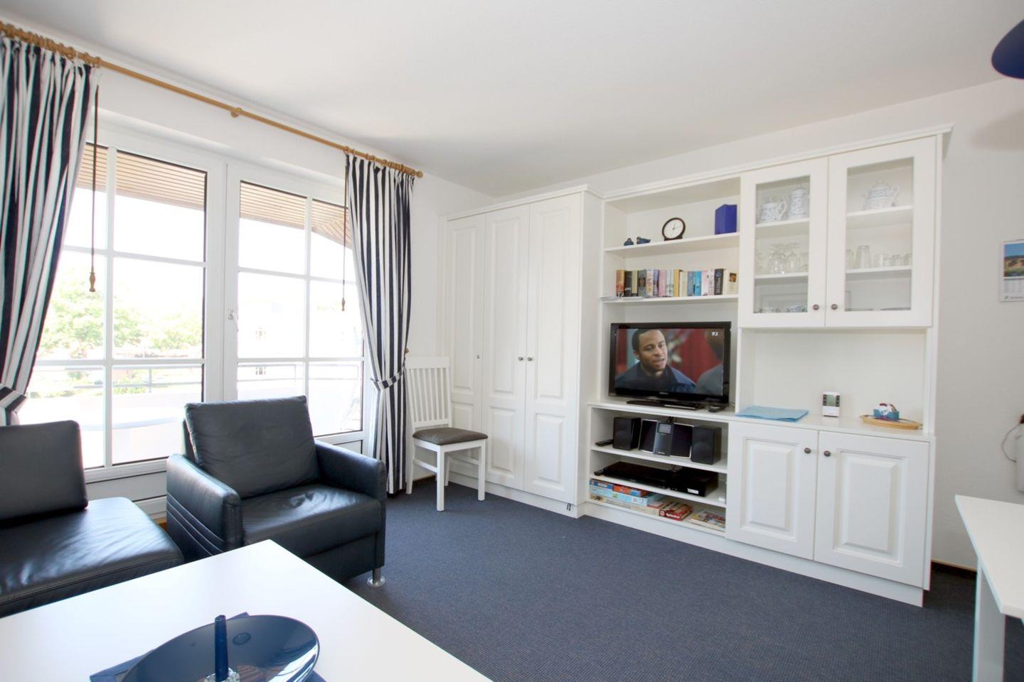 Wohnung 18, ca. 45 qm: 2-ZIMMERWOHNUNG in der 2. Etage mit Westbalkon. WOHNZIMMER: Schafcouch + 1 Sessel , Esstisch mit 4 Stühlen und KÜCHENZEILE: komplette Ausstattung. SCHLAFZIMMER: 2 Einzelbetten, Kleiderschrank und extra TV. FLUR mit Garderobe. BAD mit Dusche und WC.