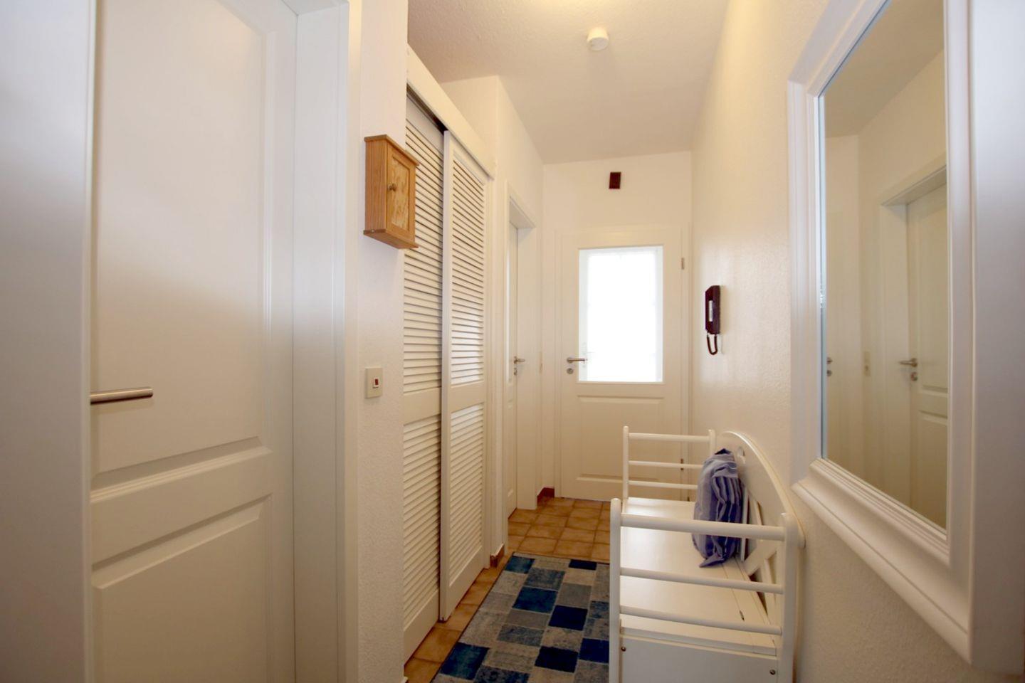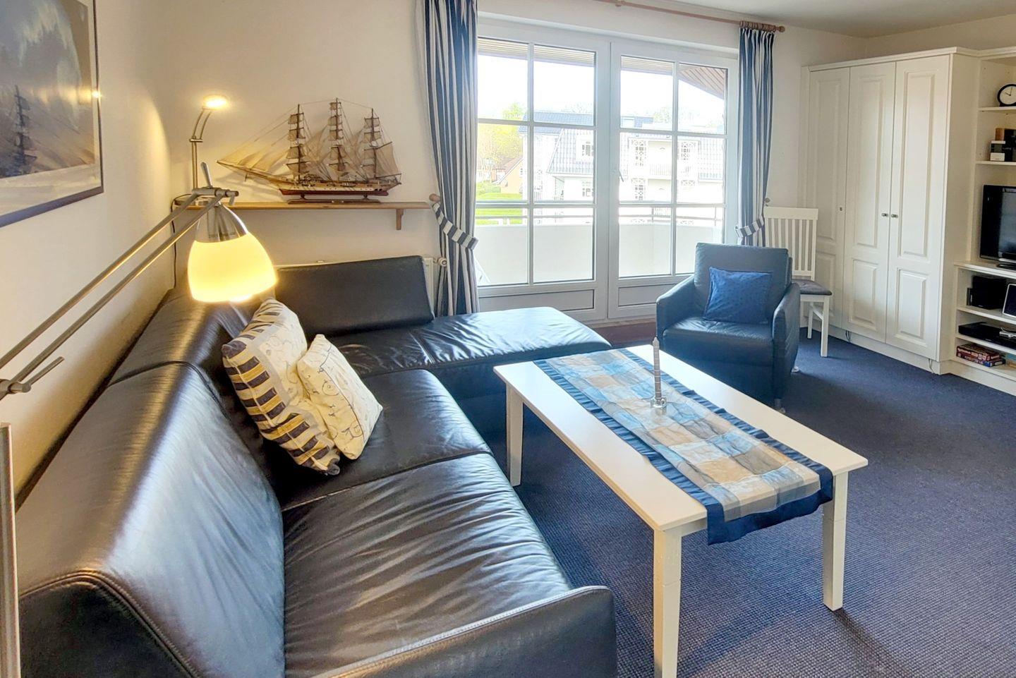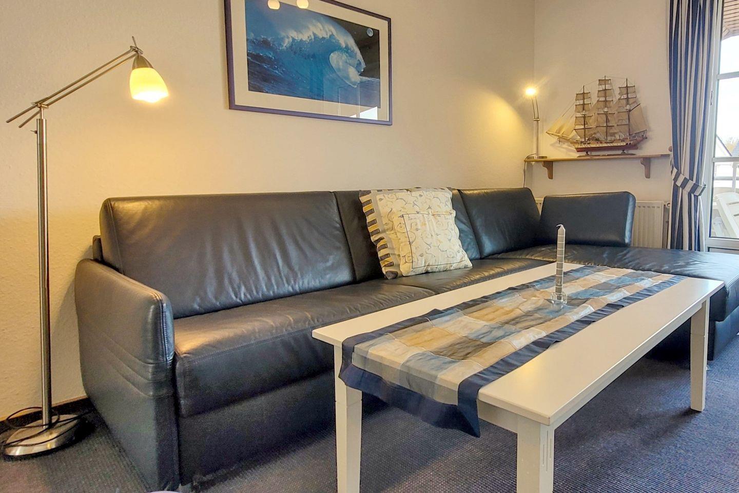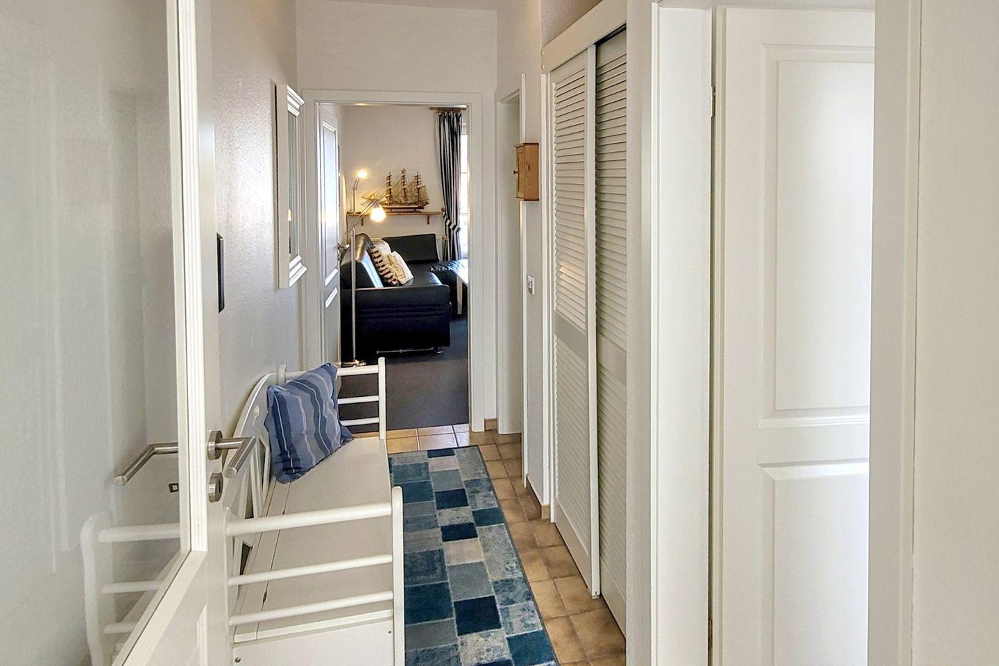 Wohnung 18, ca. 45 qm: 2-ZIMMERWOHNUNG in der 2. Etage mit Westbalkon. WOHNZIMMER: Schafcouch + 1 Sessel , Esstisch mit 4 Stühlen und KÜCHENZEILE: komplette Ausstattung. SCHLAFZIMMER: 2 Einzelbetten, Kleiderschrank und extra TV. FLUR mit Garderobe. BAD mit Dusche und WC.