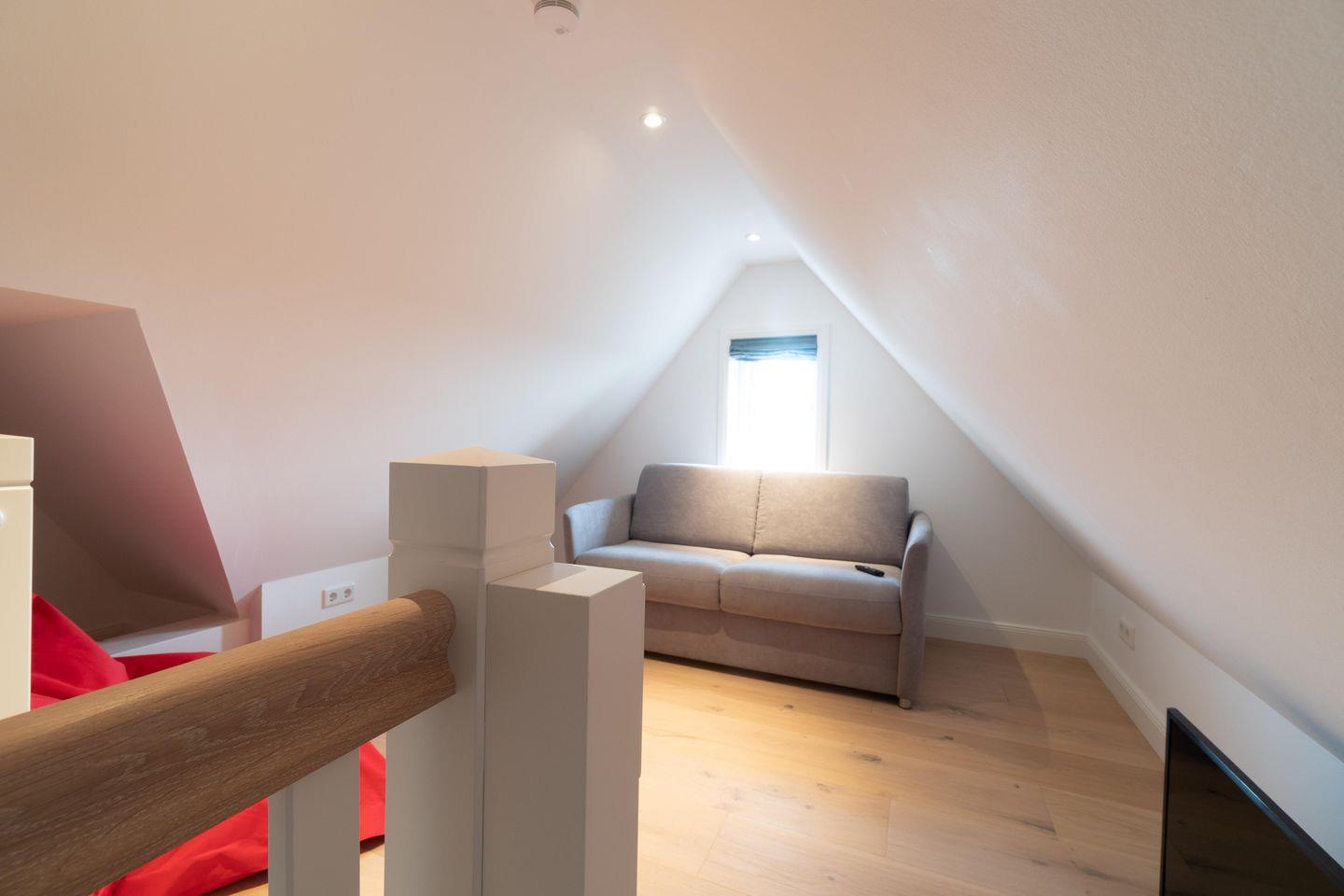 Im Dachgeschoss befindet sich ein weiterer Aufenthaltsraum. In diesem steht Ihnen ein Sofa sowie ein TV zur Verfügung.