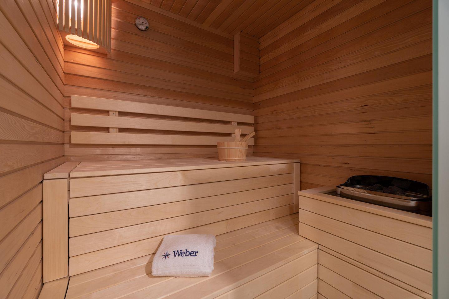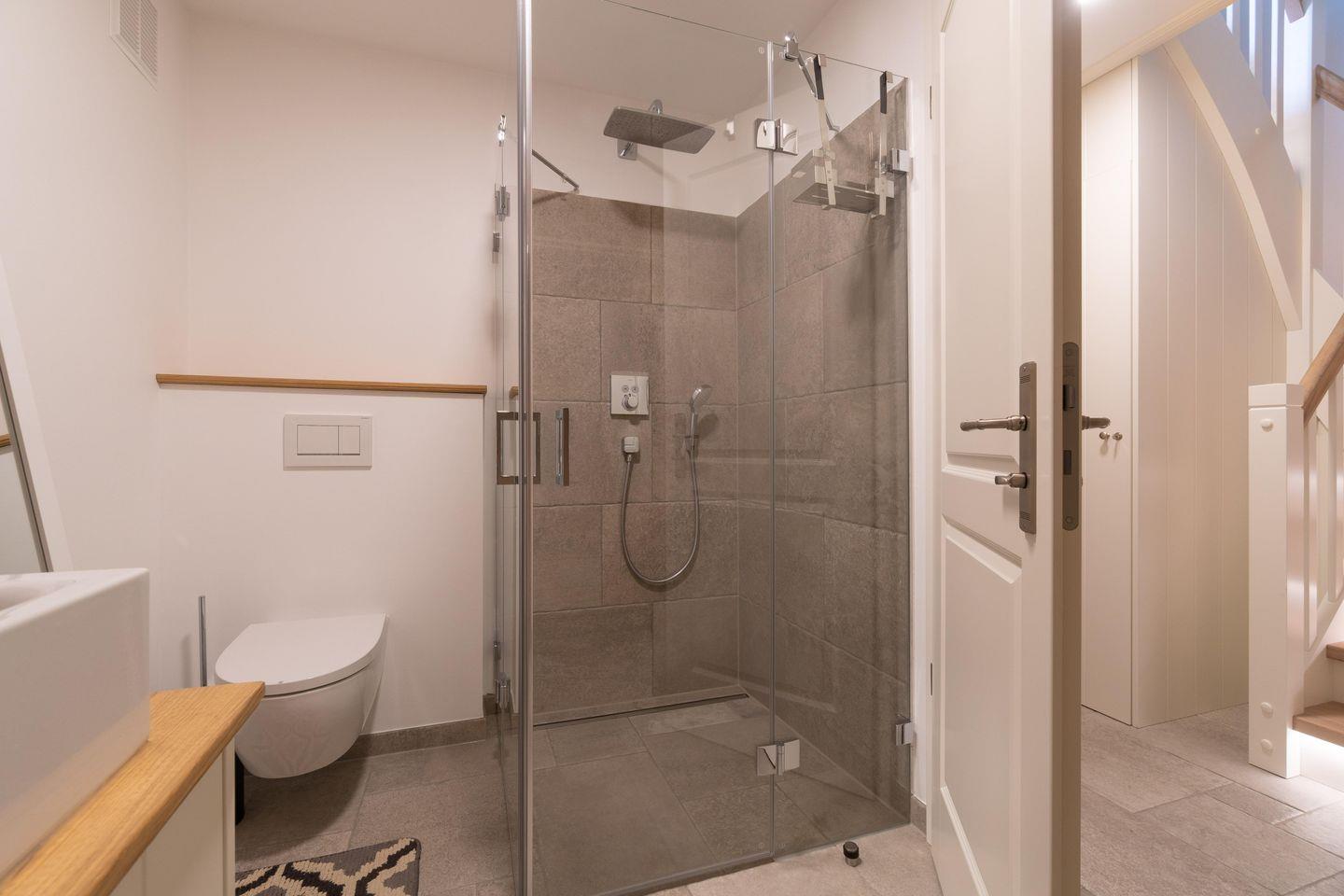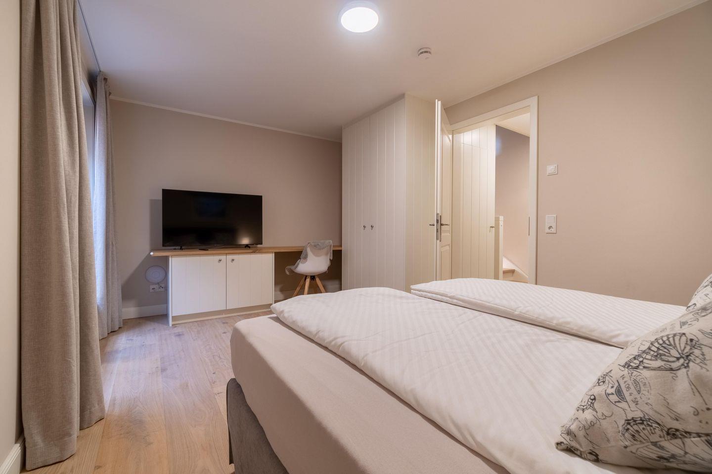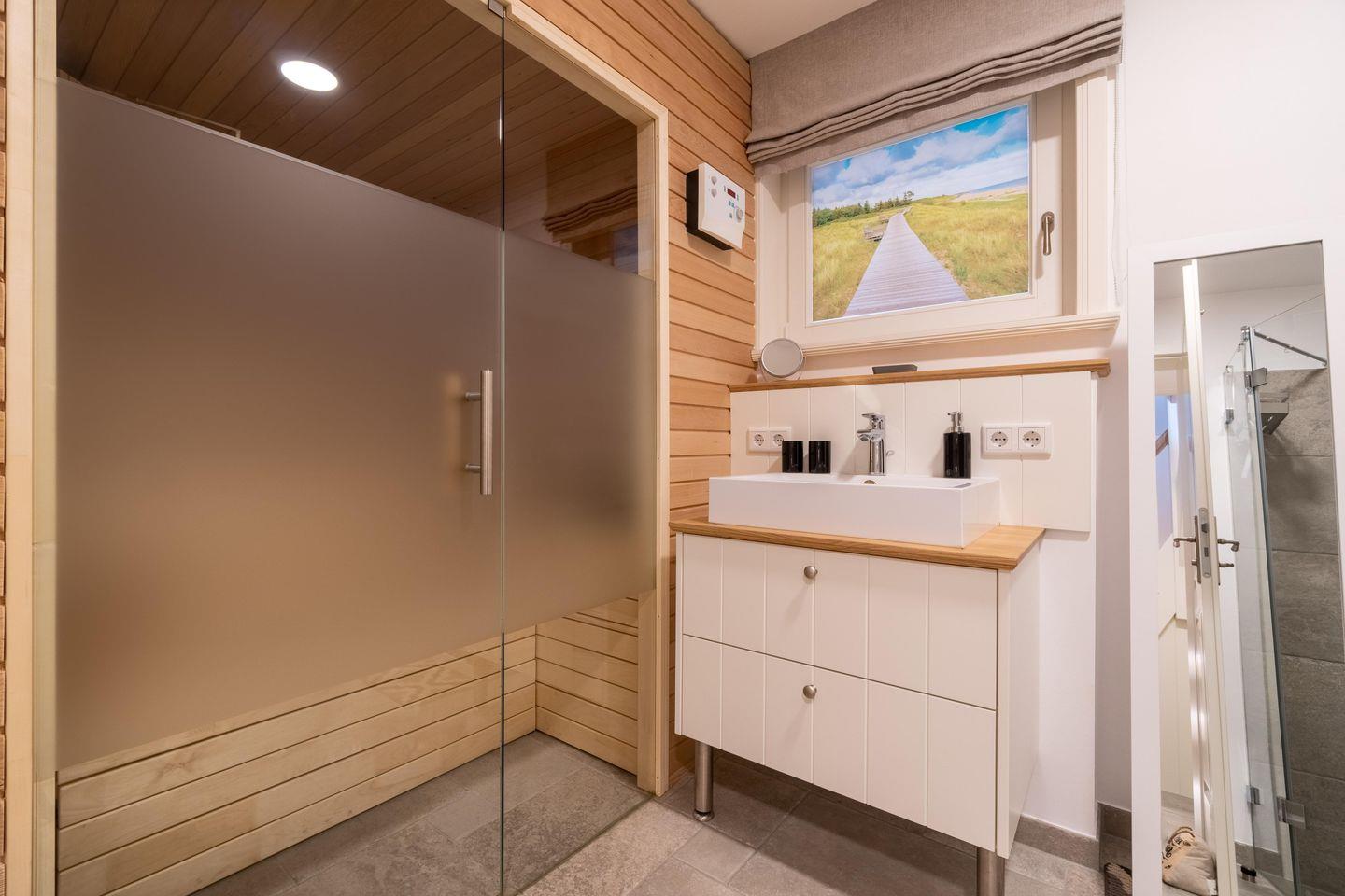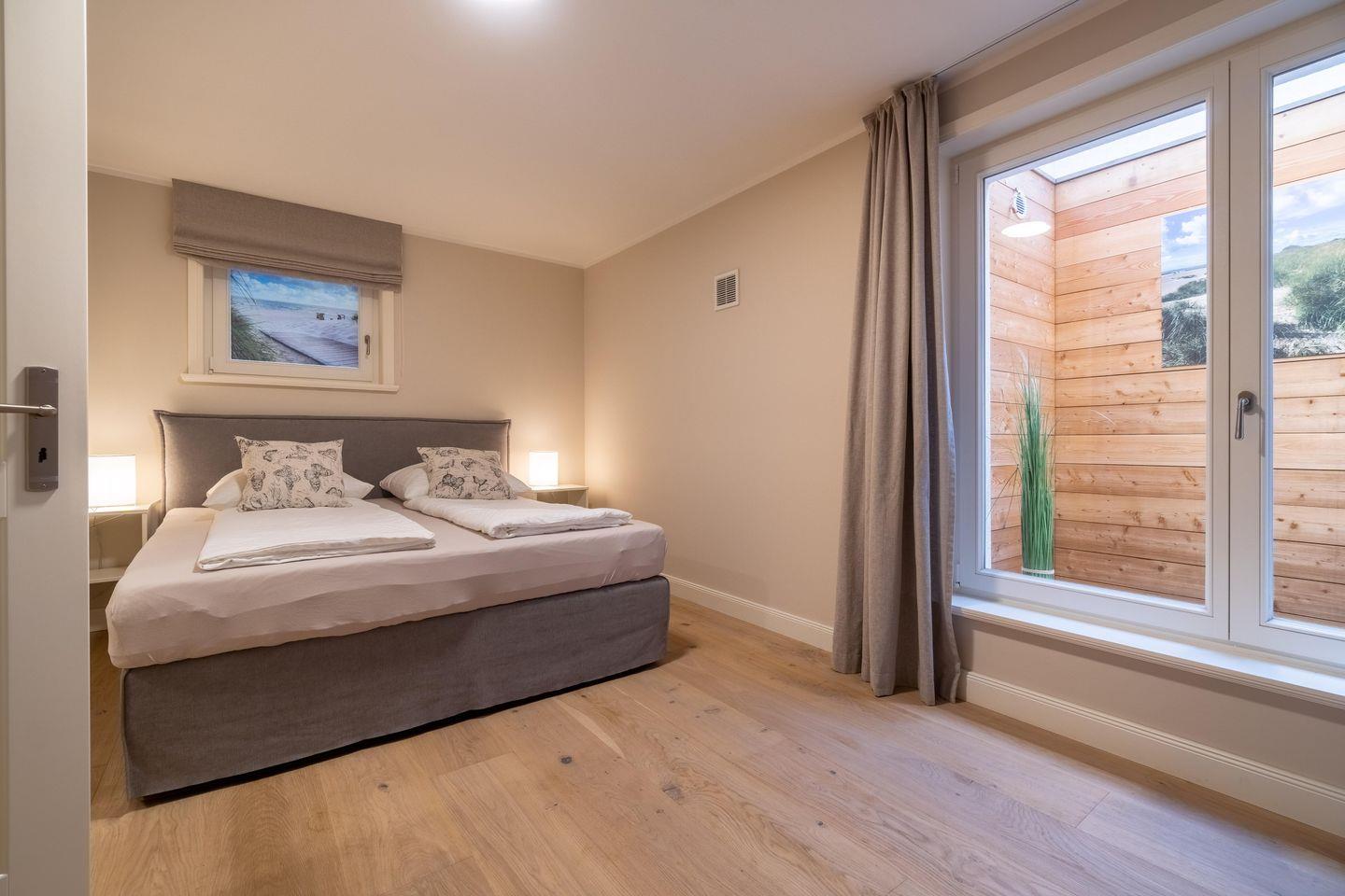 Im Souterrain befinden sich das dritte Schlafzimmer und das zweite Duschbad, die hauseigene Sauna sowie ein Hauswirtschaftsraum mit Waschmaschine und Trockner. Das Schlafzimmer verfügt über ein Doppelbett und ein Panoramafenster.