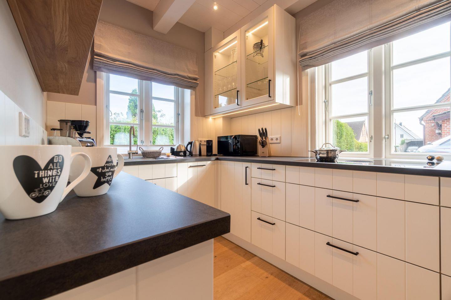 Im Erdgeschoss befinden sich der großzügige Wohn- und Essbereich mit offener Küche sowie ein Gäste-WC. Über den Wohnbereich gelangen Sie auf die Terrasse und in den Garten. Der Original Mylin-Kachelofen sorgt auch an kühleren Tagen für eine angenehme Atmosphäre. Die Möbel des Hauses und die Kücheneinrichtung wurden von einer hiesigen Tischlerei maßgefertigt.