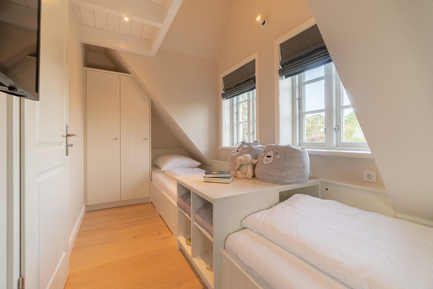 Im Obergeschoss befinden sich zwei der drei Schlafzimmer - eines mit einem Doppelbett und eines mit zwei Einzelbetten - sowie eines der beiden Duschbäder. Beide Schlafzimmer sind jeweils mit einem Flachbild-TV versehen.