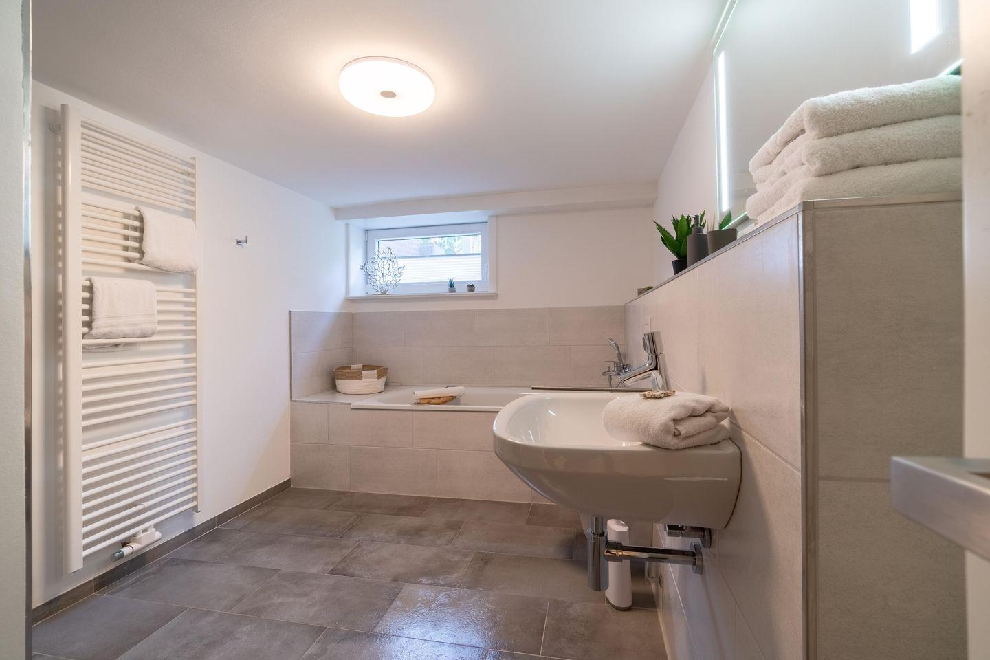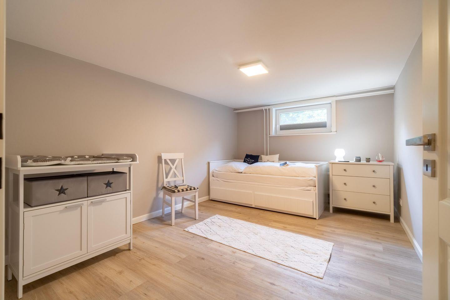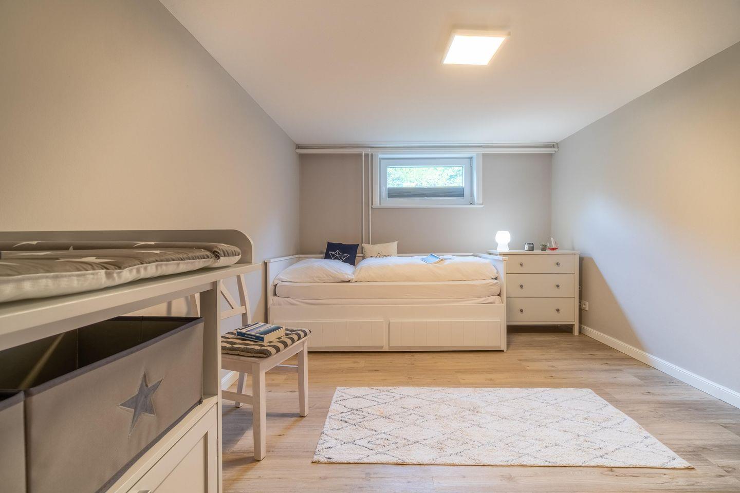 Im Souterrain sind zwei weitere Schlafzimmer mit Fenstern und das Vollbad gelegen. Eines der Schlafzimmer verfügt über einen Wickeltisch und ein Ausziehbett. Das Souterrain ist auch durch eine außenliegende Treppe mit separatem Eingang zu erreichen.