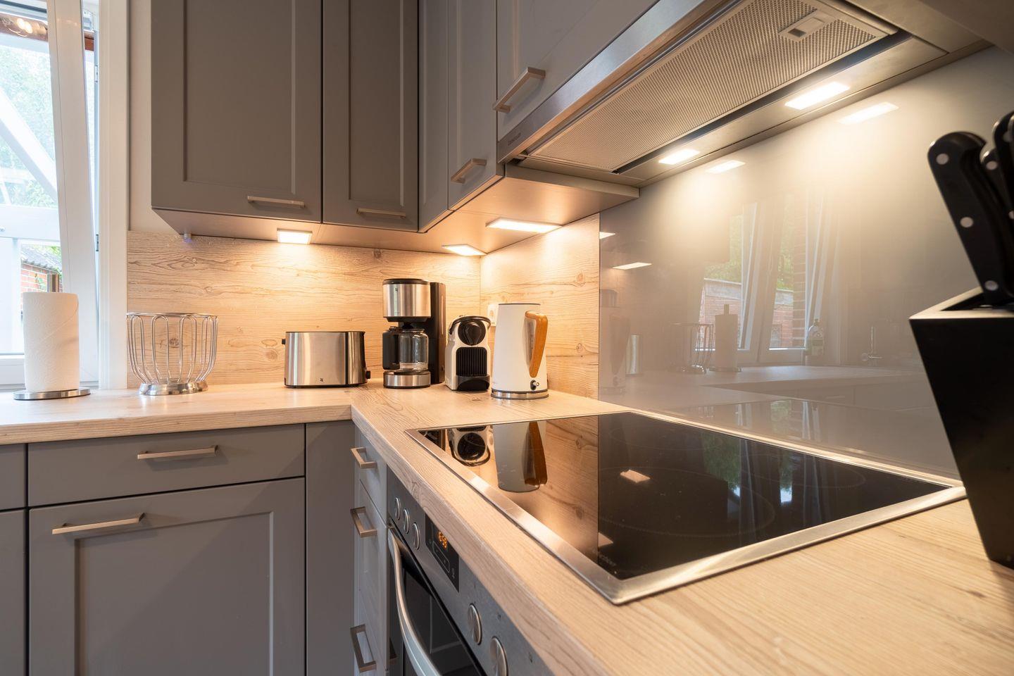 Zu den Highlights der Ferienunterkunft zählen wir u. a. den großzügigen und voll umzäunten Garten mit Terrasse und großer Markise sowie die App-gesteuerte Lichtanlage der Marke Philips Hue.