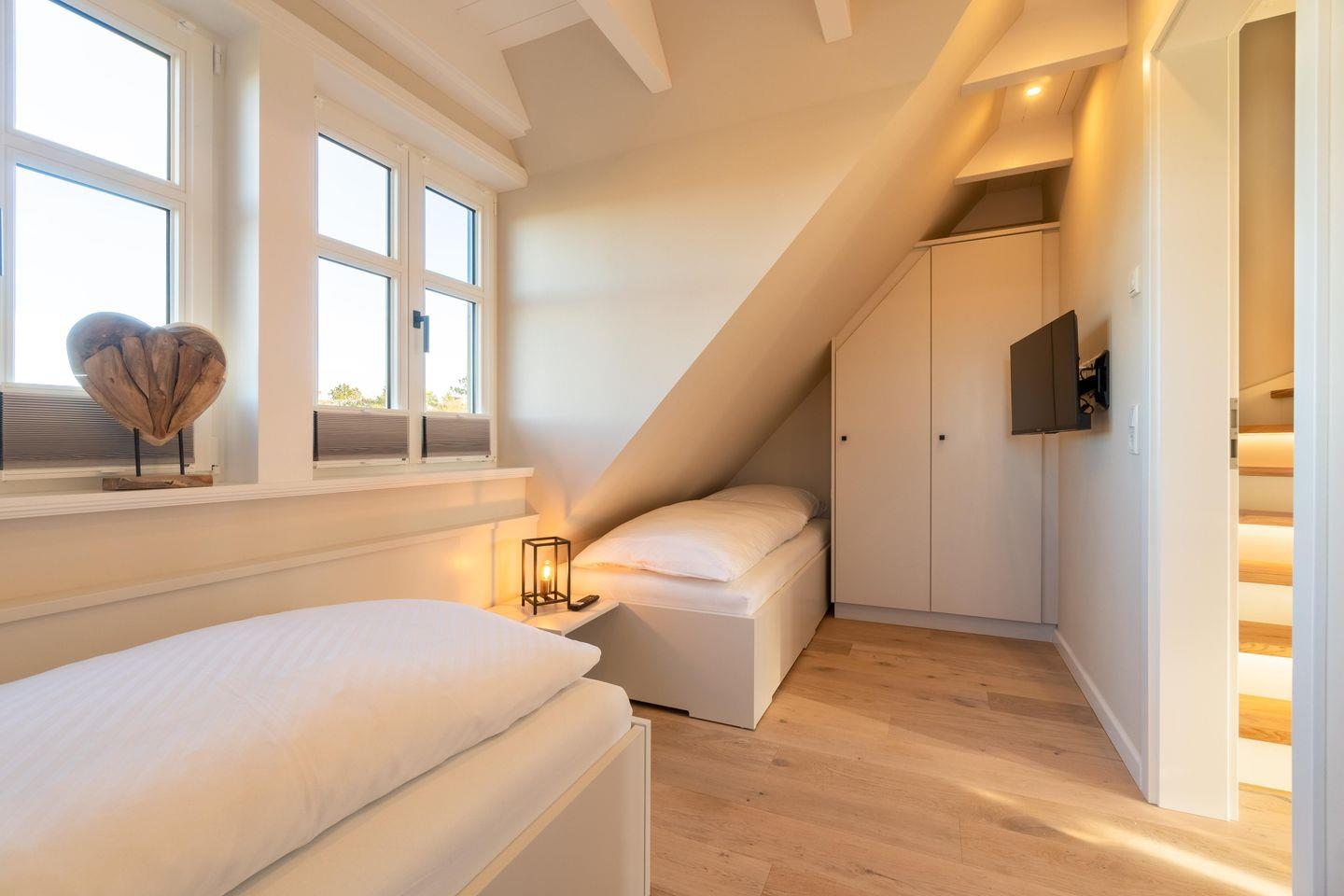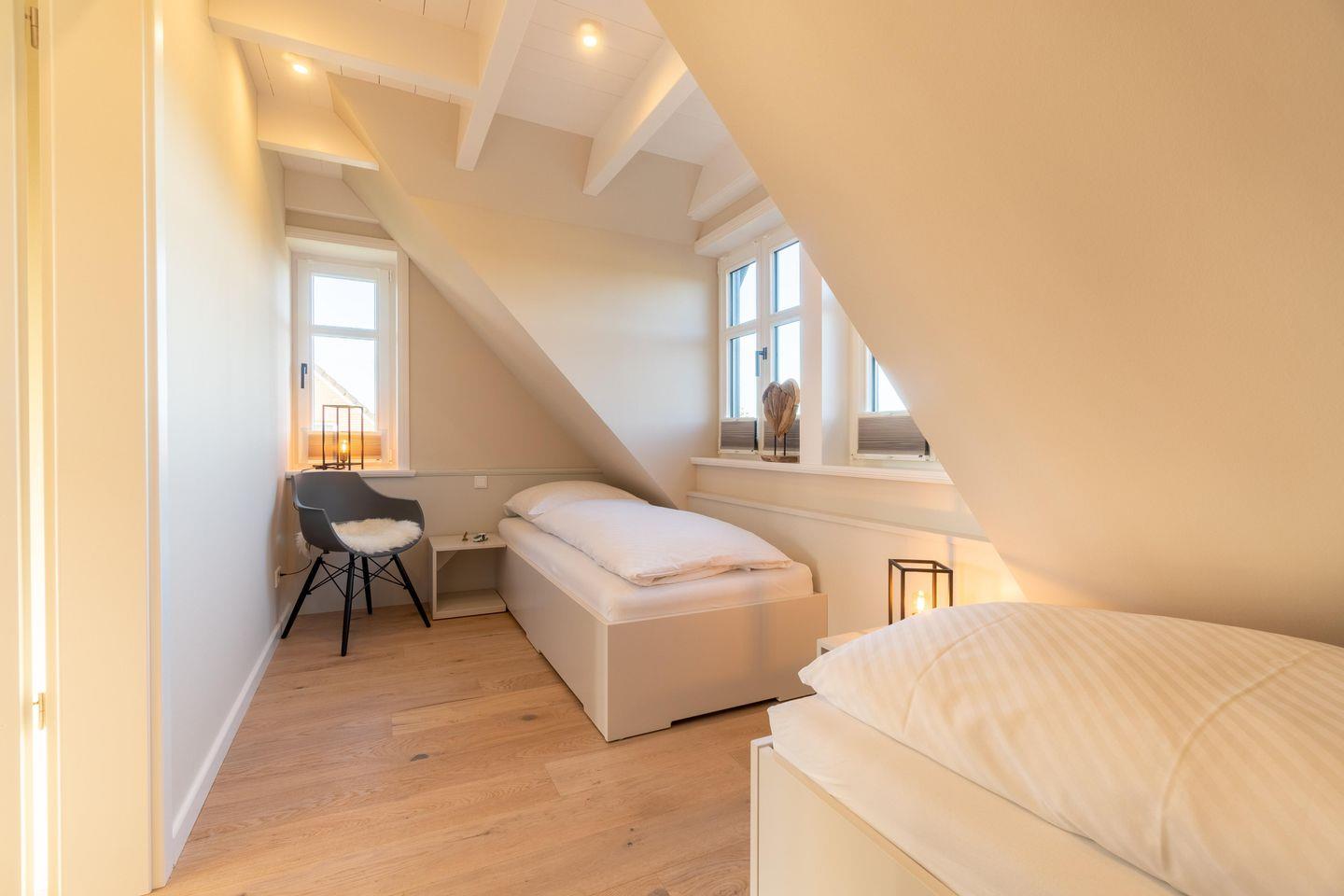 Im Obergeschoss sind die beiden Schlafzimmer sowie das zweite Duschbad gelegen. Das erste Schlafzimmer verfügt über ein Doppelbett, das zweite über zwei Einzelbetten, die auch zu einem Doppelbett zusammengeschoben werden können. Die Betten und Einbauschränke wurden von einer hiesigen Tischlerei angefertigt. Im Duschbad befinden sich eine Waschmaschine und ein Trockner sowie ein weiteres Sonos-Radio.