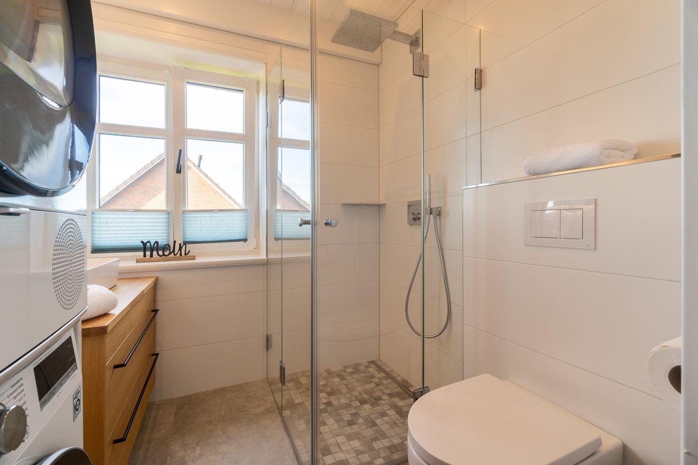 Im Erdgeschoss befinden sich der großzügige Wohn- und Essbereich mit offener Küche sowie eines der zwei Duschbäder. Über den Wohnbereich gelangen Sie direkt auf die eigene Terrasse und in den Garten. Der Kamin und das WLAN-fähige Radio der Marke Sonos sorgen auch an kühleren Tagen für eine wohlige Atmosphäre. Die Küche ist mit hochwertigen Markengeräten ausgestattet, wie z. B. einem Nespresso-Kapselmaschine mit Milchaufschäumer und Frenchpress.