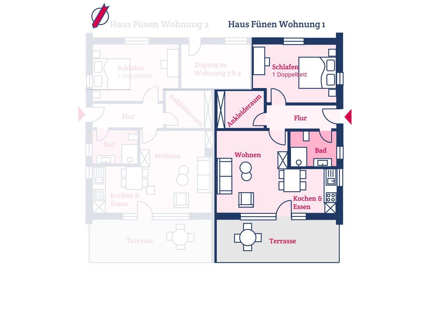 Die Erdgeschosswohnung verfügt über einen Wohn- und Essbereich mit offener Küche sowie einer Schlafcouch, ein Schlafzimmer mit Doppelbett und ein Duschbad. Über den Wohnbereich gelangen Sie direkt auf die eigene Terrasse und in den gemeinschaftlich genutzten Garten.
