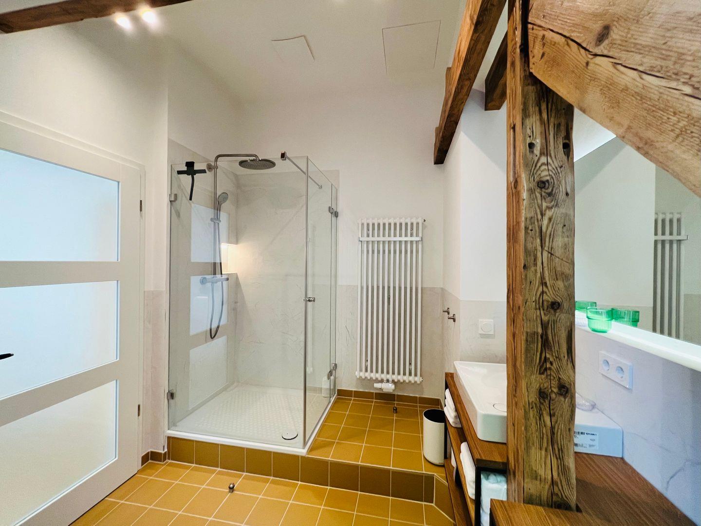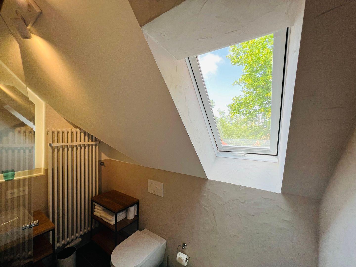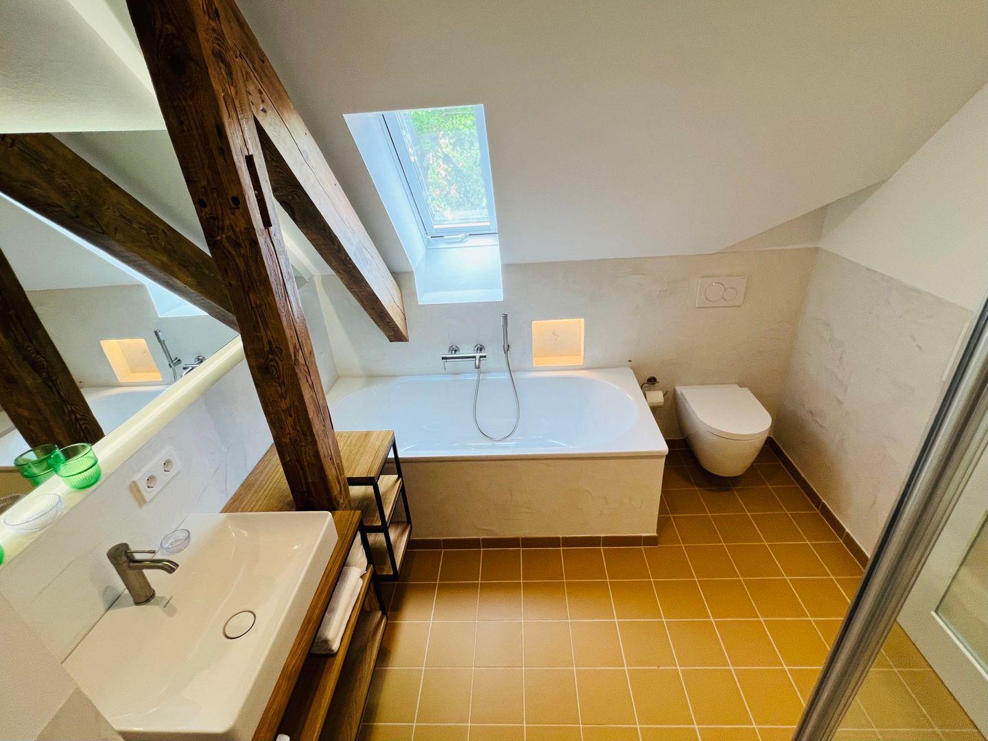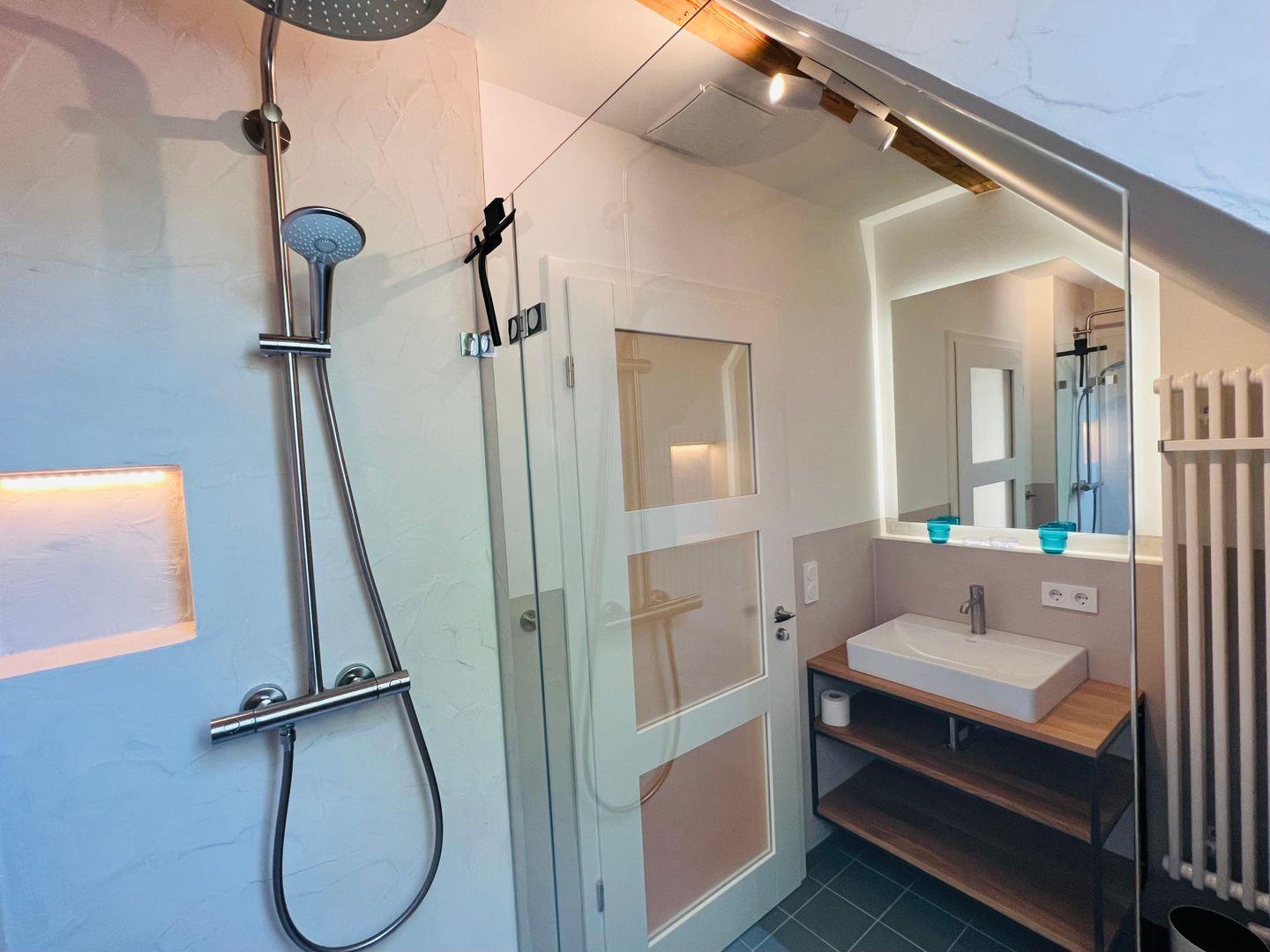 Die Ferienwohnung ist vollständig im Dachgeschoss gelegen und verfügt über einen großzügigen Wohn- und Essbereich mit offener Küche, ein Schlafzimmer mit Doppelbett und Vollbad en Suite, ein Schlafzimmer mit zwei Einzelbetten, sowie ein separates Duschbad. Über den Essbereich gelangen Sie direkt auf den eigenen Balkon mit Blick in die Natur.