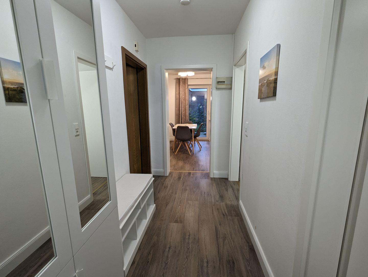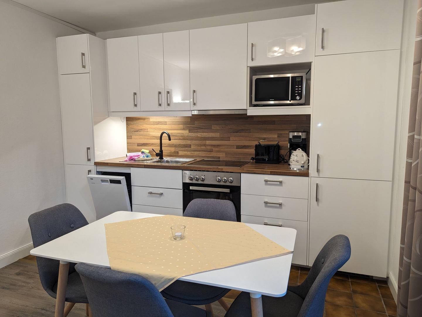 Es ist wie folgt aufgeteilt: WOHNBEREICH (ein Sofa, ein Sessel, ein Couchtisch, Sat-TV, CD-Player, kostenloses Internet), West-BALKON mit Gartenmöbel und Gartenblick, vollausgestattete WOHNKÜCHE mit Essbereich (u.a. Esstisch mit 4 Stühlen, Geschirrspüler, Mikrowelle, Backofen, Ceranfeld, Kühlschrank mit Gefrierfach, Kaffeemaschine, Toaster, Eierkocher, Besteck und Töpfe), SCHLAFZIMMER mit einem Doppelbett (180 x 200 cm) und einem Kleiderschrank, ein zweites SCHLAFZIMMER mit einem Einzelbett und einem Kleiderschrank, BADEZIMMER mit Dusche, Fenster, WC, Handtuchwärmer, Waschbecken, Spiegelschrank und Föhn, FLUR mit einer Garderobe für Jacken und einem Schuhschrank. Zur Wohnung gehört ein Parkplatz direkt am Haus. Von beiden Schlafzimmern haben Sie einen schönen Blick zum Hafen.