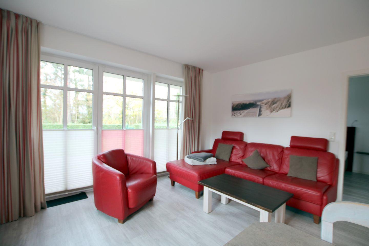Das helle WOHNZIMMER mit bodentiefen Fenstern und direktem Zugang zur Terrasse ist mit einer Couch mit Ottomane und 1 Sessel und Couchtisch gemütlich eingerichtet