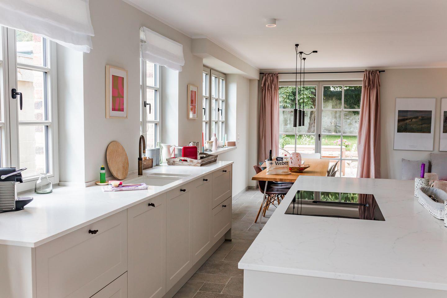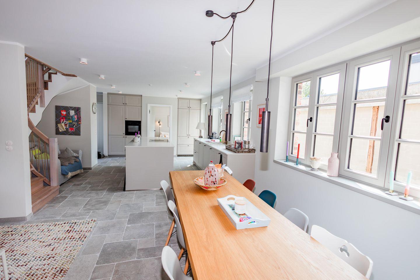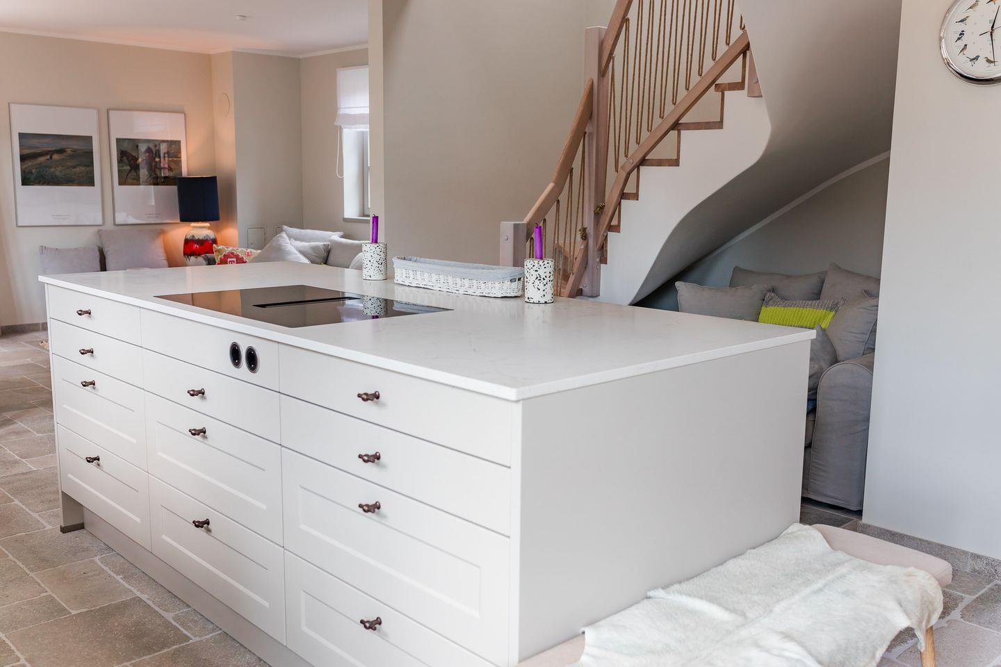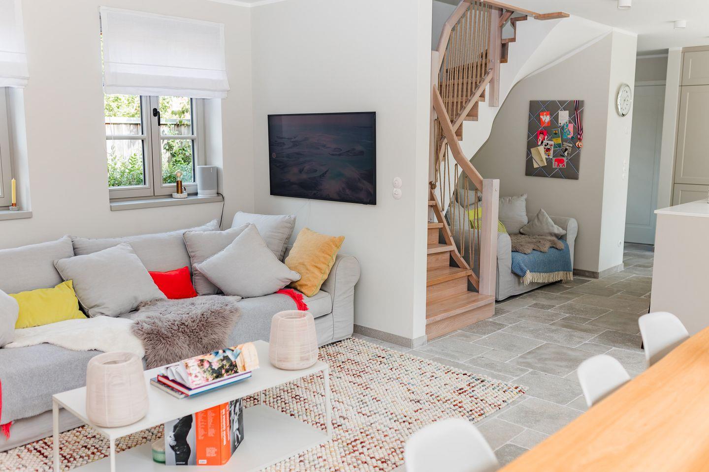 Im Erdgeschoss befinden sich der großzügige Wohn- und Essbereich mit offener Küche, ein separates Wohnzimmer, ein Gäste-WC und ein Hauswirtschaftsraum mit Waschmaschine und Trockner. Über die beiden Wohnzimmer gelangen Sie auf die Terrasse und in den eigenen Garten. Die Küche ist mit hochwertigen Markengeräten ausgestattet, das Herzstück bildet die Kochinsel mit integriertem Tresen.