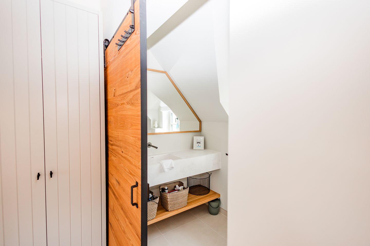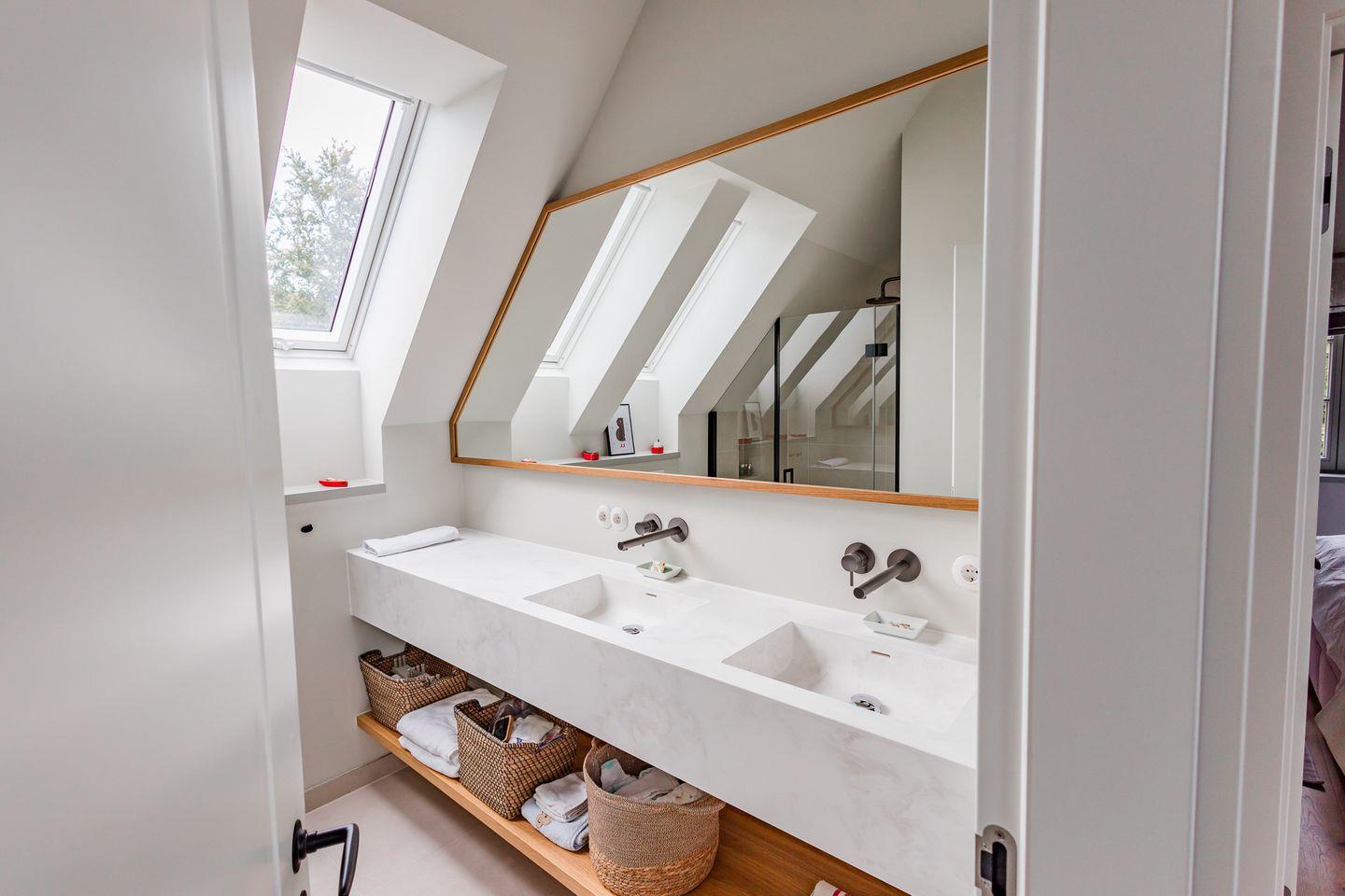 Im Obergeschoss sind die drei Schlafzimmer - eines davon mit Doppelbett und Duschbad en Suite - sowie ein zusätzliches Duschbad gelegen. Die beiden weiteren Schlafzimmer verfügen jeweils über ein Etagenbett (Breite 1,40 m).