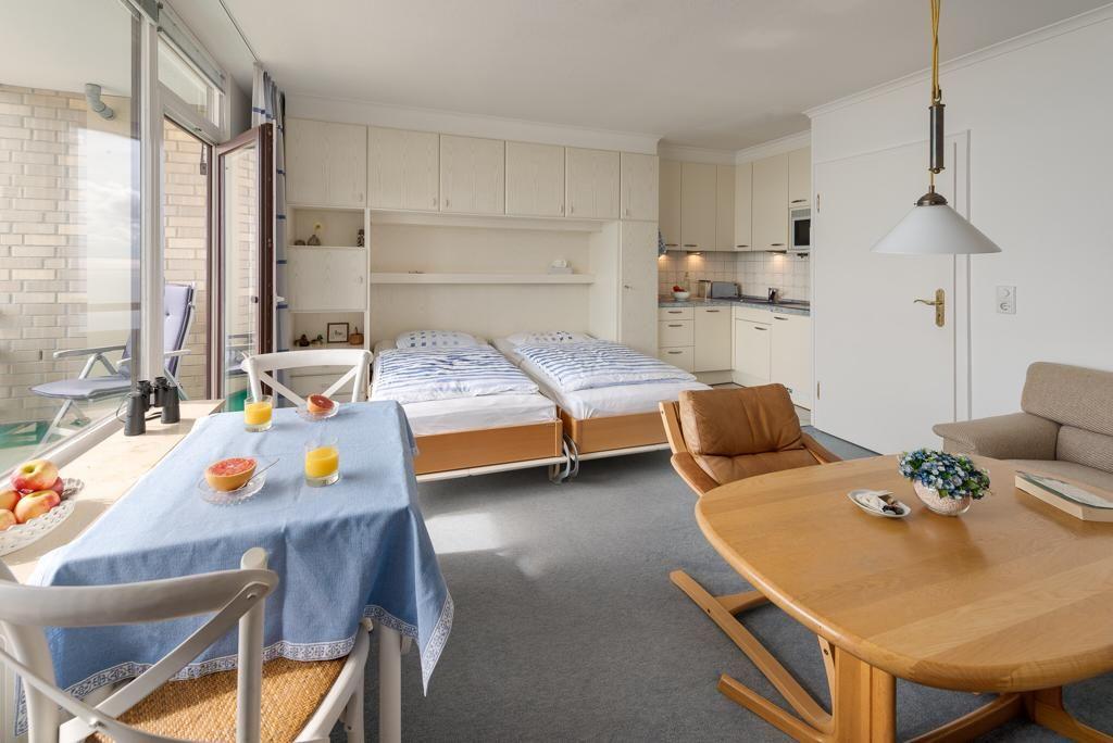 Das Appartement befindet sich im 4. Stock und ist mit dem Fahrstuhl (ab Hochparterre, bis dahin sind es ca. 6 Treppenstufen) erreichbar. Sobald Sie durch die Appartementtür gehen, haben Sie einen herrlichen Meerblick. Das macht das Appartement so hell und freundlich. Der Balkon ist überdacht, so dass Sie auch bei Regen draußen sitzen und den Meerblick genießen können. Sie haben einen uneingeschränkten Blick auf die Nordsee und die Halligen.
