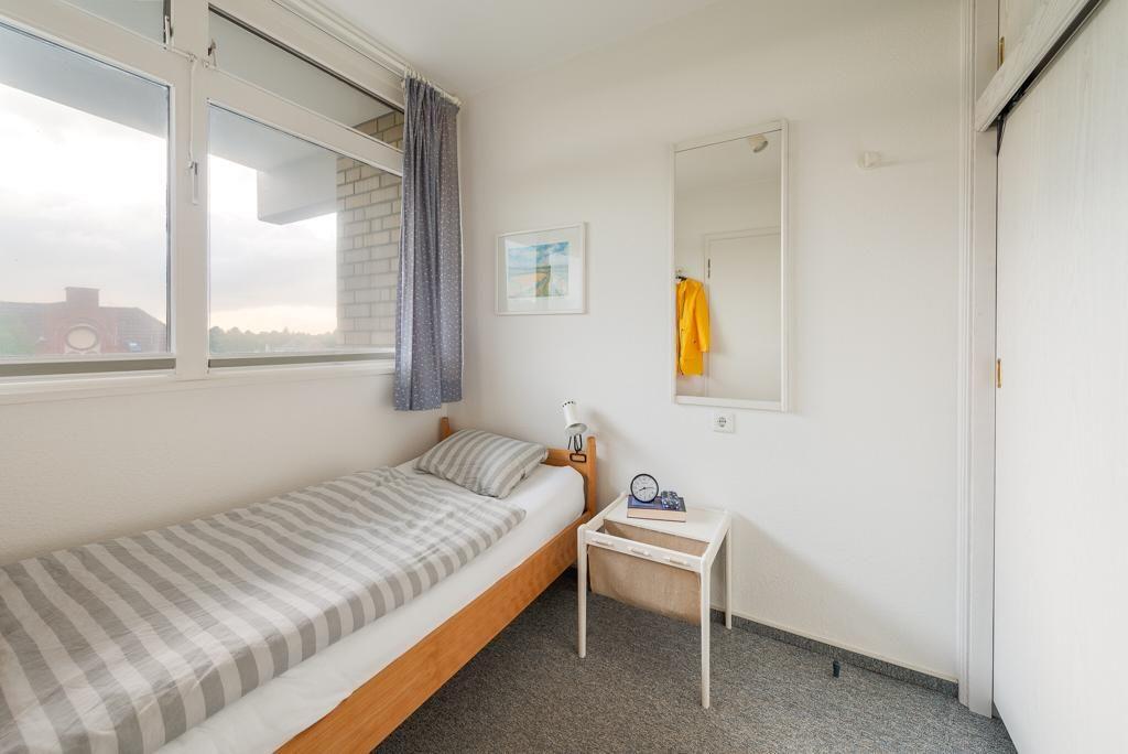 Das Schlafzimmer mit einem Einzelbett schafft eine gemütliche Atmosphäre und eine ruhige Rückzugsmöglichkeit. Im Wohnzimmer erwartet Sie ein komfortables Schrankbett, das zusätzlichen Platz für zwei Personen bietet. Hier können Sie sich entspannen und den Blick auf das Meer durch die Fenster genießen.
