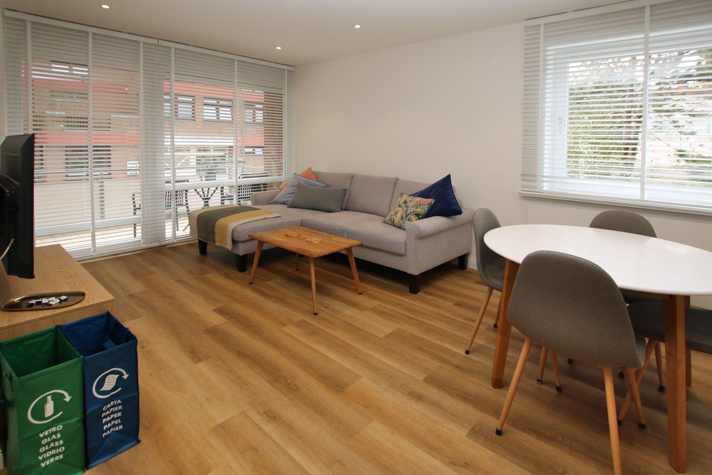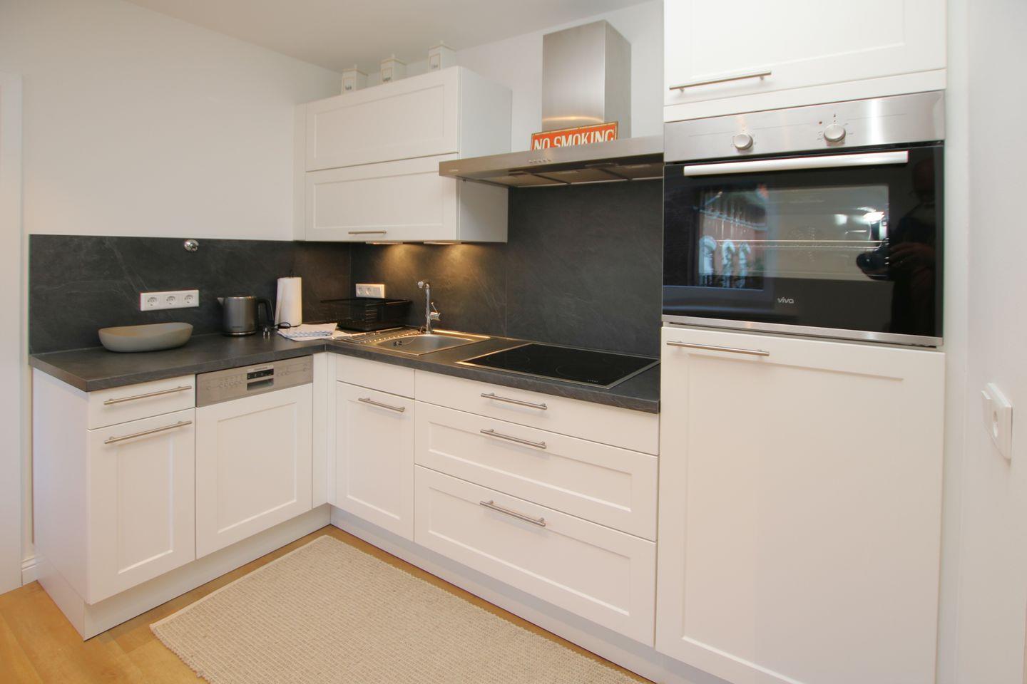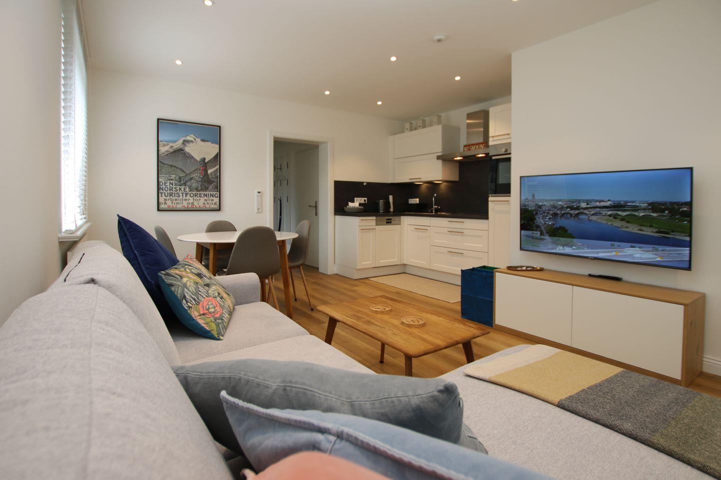 Im gemütlichen WOHNZIMMER mit ESSBEREICH und KÜCHE entspannen sie auf einer Eckcouch (48cm hoch) und können den Abend vor dem großen Smart/TV ausklingen lassen.