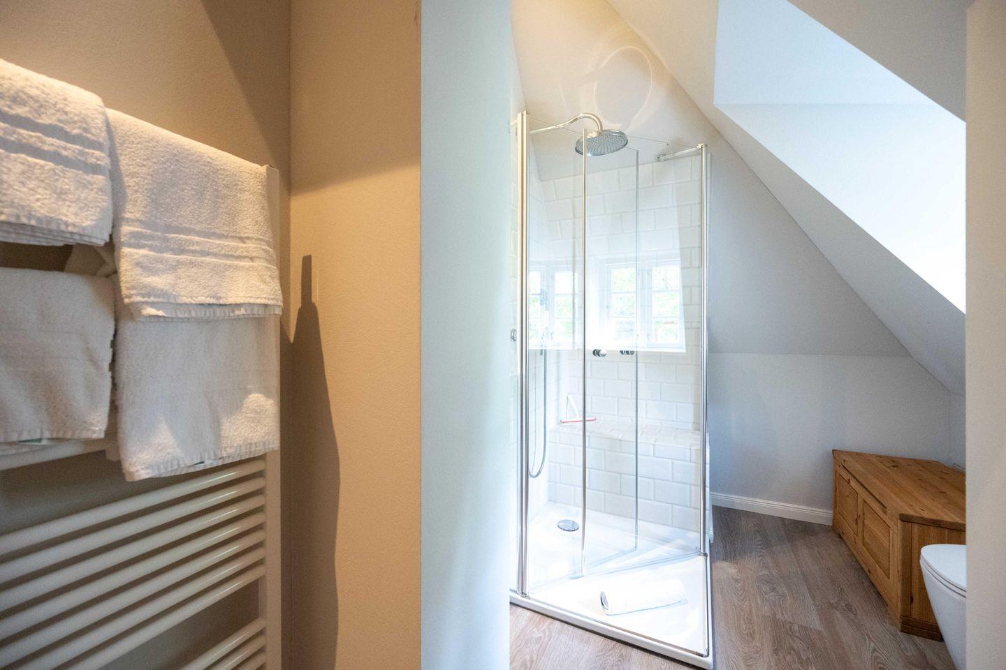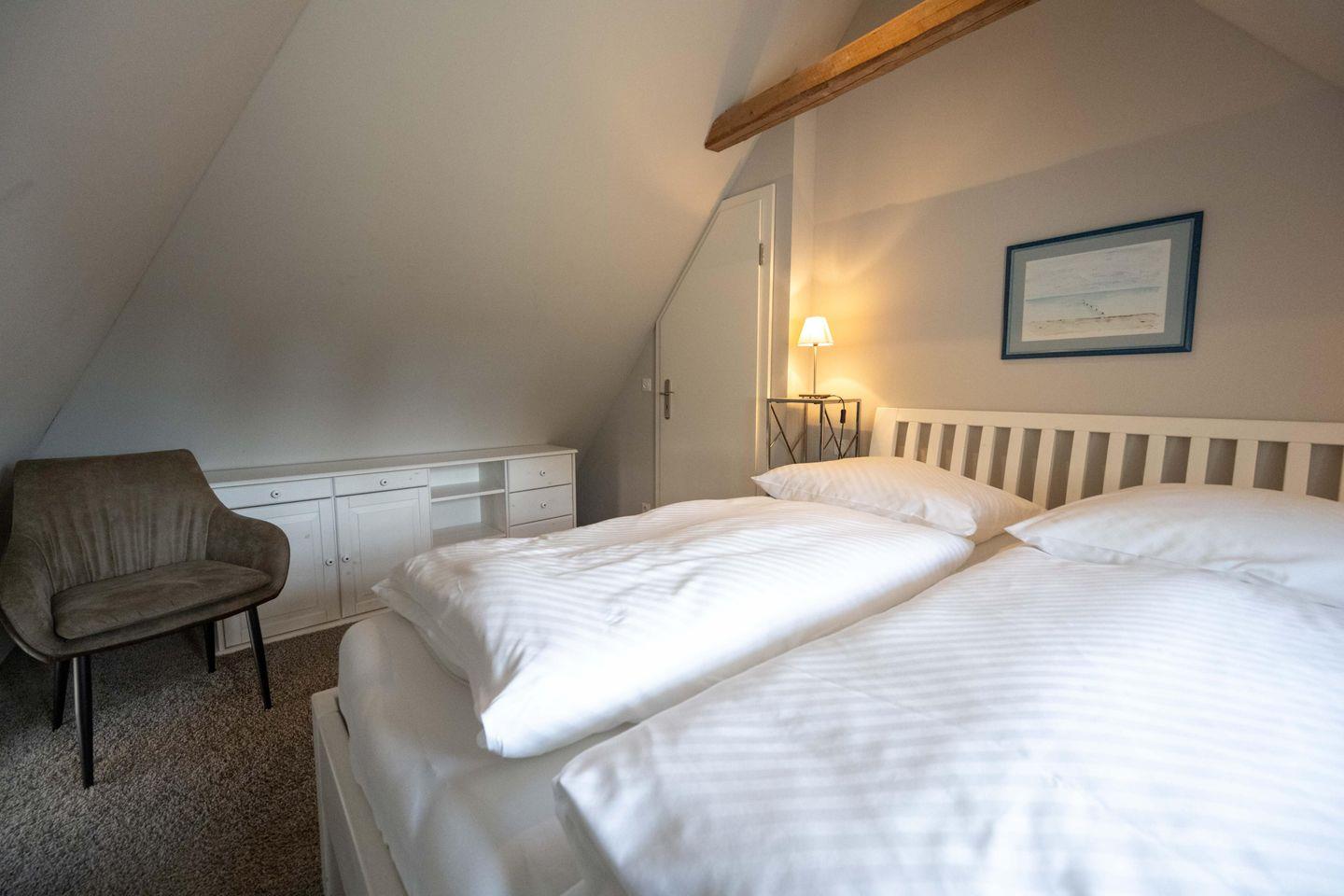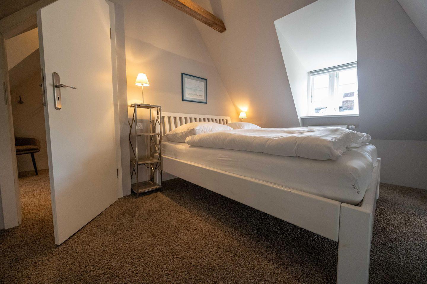 Im Obergeschoss sind die beiden Schlafzimmer sowie das Duschbad mit Waschmaschine gelegen. Das erste Schlafzimmer ist mit einem Doppelbett ausgestattet. Das zweite Schlafzimmer verfügt über zwei sehr komfortable Bodenmatratzen, die bei einer Buchung mit vier Personen nebeneinander und bei einer Buchung mit drei Personen übereinander gelegt werden.