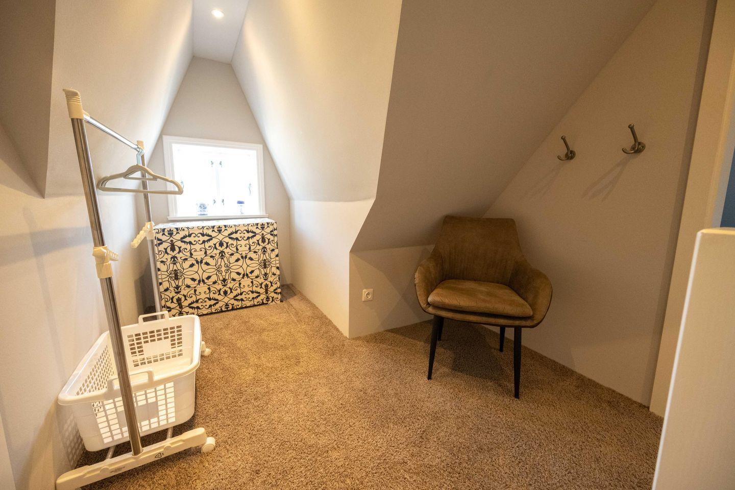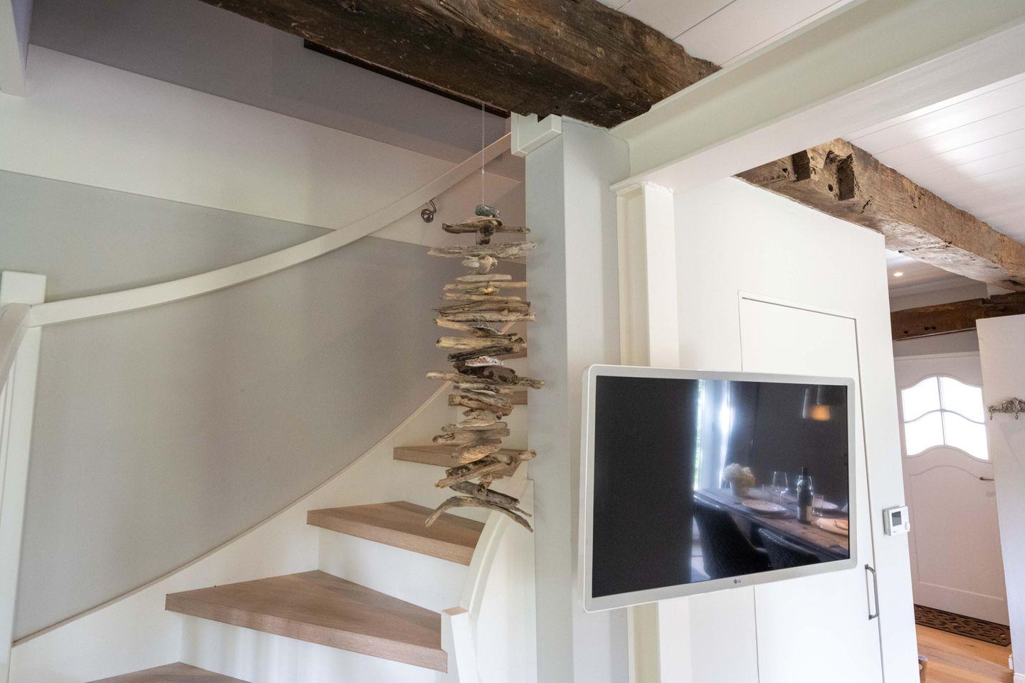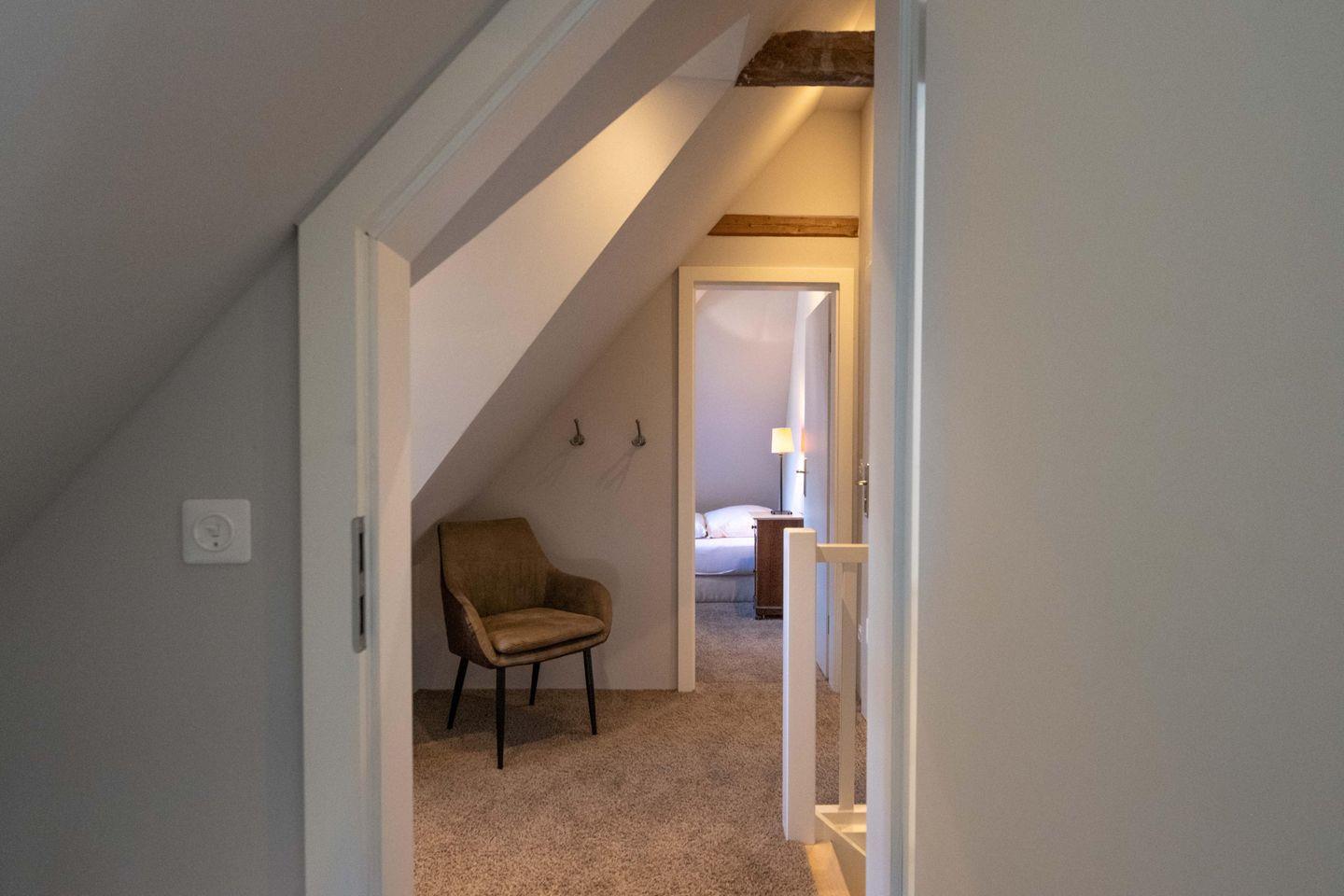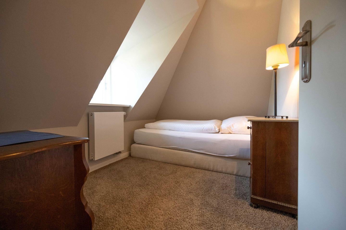 Im Obergeschoss sind die beiden Schlafzimmer sowie das Duschbad mit Waschmaschine gelegen. Das erste Schlafzimmer ist mit einem Doppelbett ausgestattet. Das zweite Schlafzimmer verfügt über zwei sehr komfortable Bodenmatratzen, die bei einer Buchung mit vier Personen nebeneinander und bei einer Buchung mit drei Personen übereinander gelegt werden.