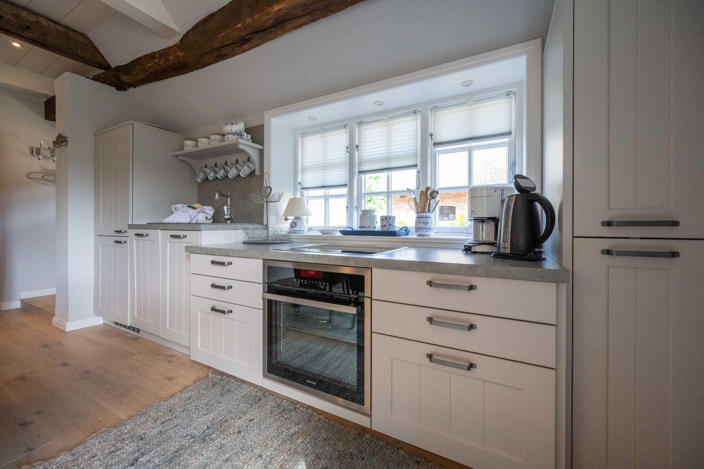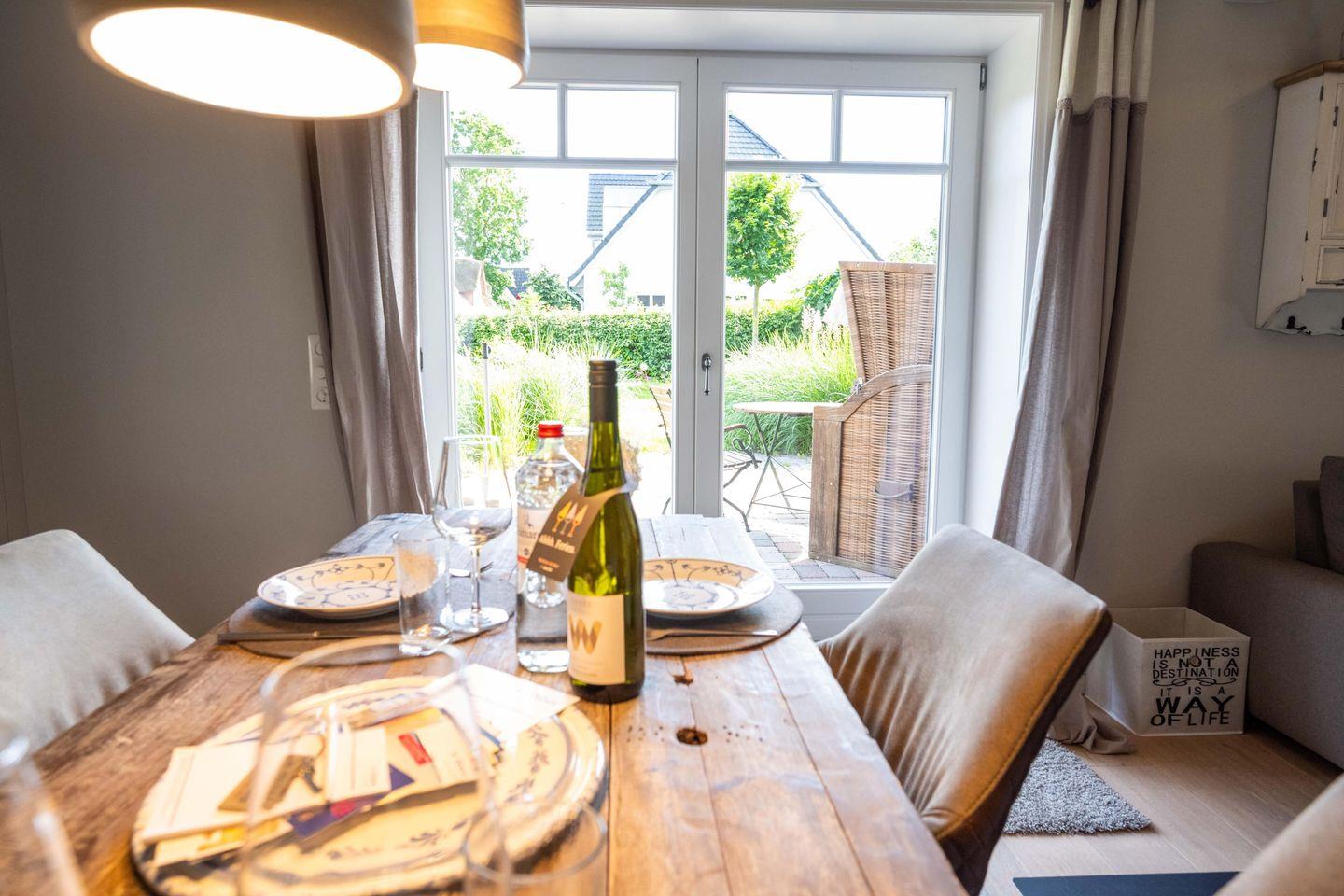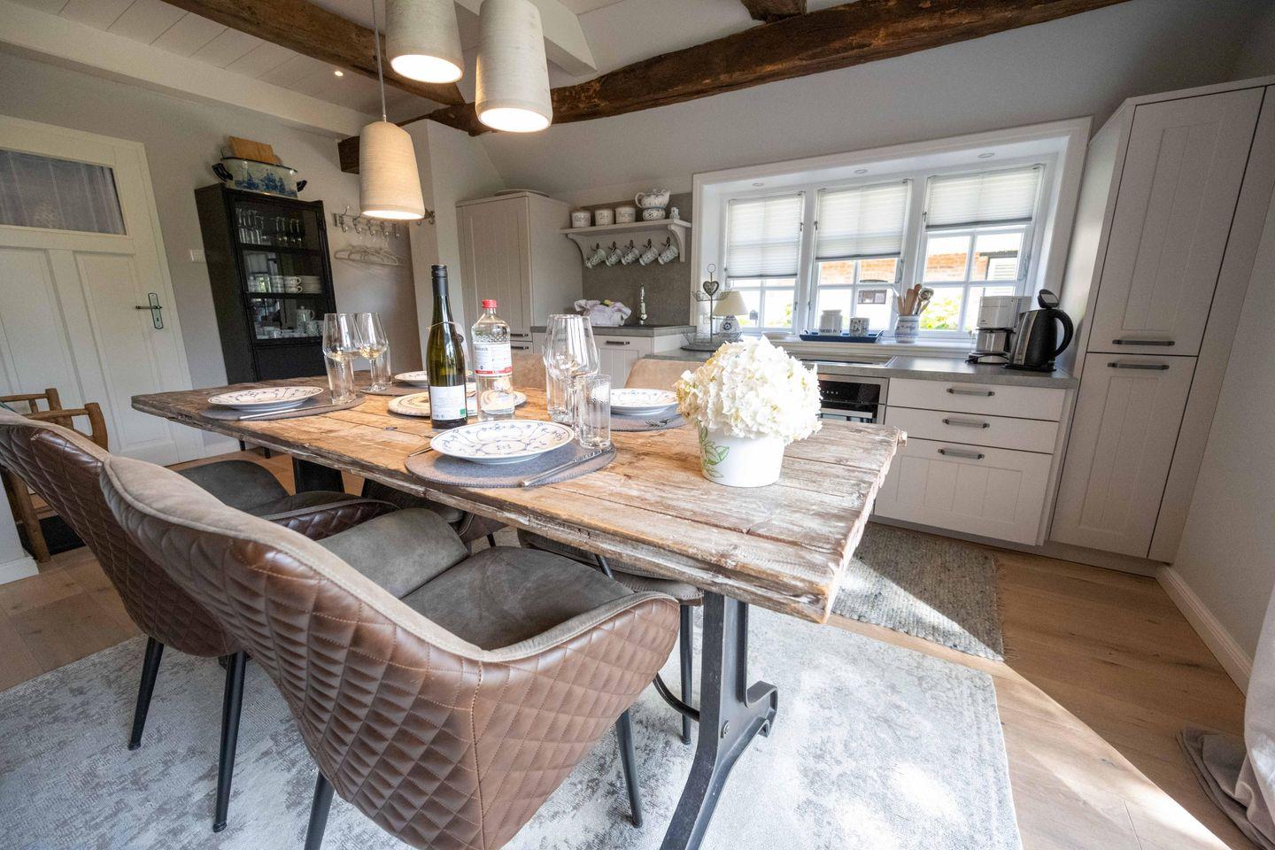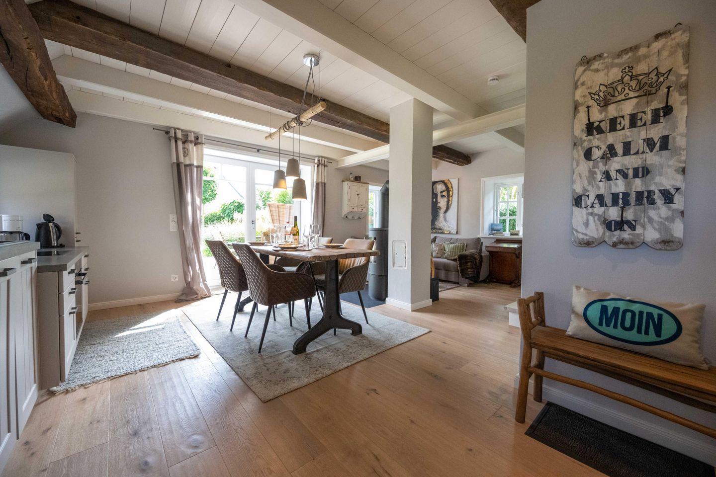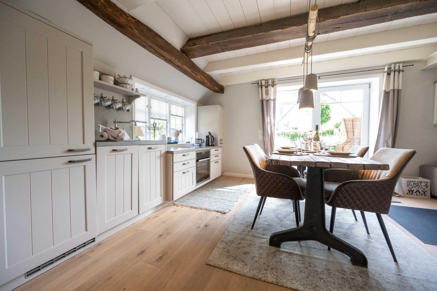 Im Erdgeschoss des freistehenden Reetdachhauses befinden sich der großzügige Wohn- und Essbereich mit offener Küche sowie ein Gäste-WC. Der Kamin im Wohnbereich sorgt auch an kühleren Tagen für eine angenehme Atmosphäre. Über den Wohnbereich gelangen Sie direkt auf die Südwestterrasse und in den eigenen Garten.