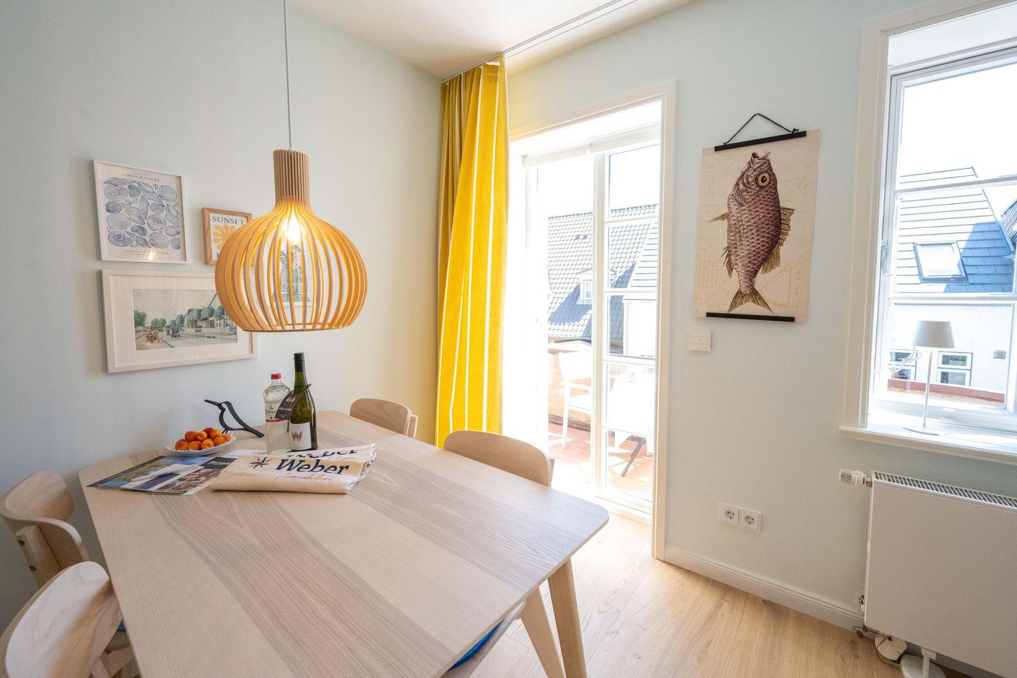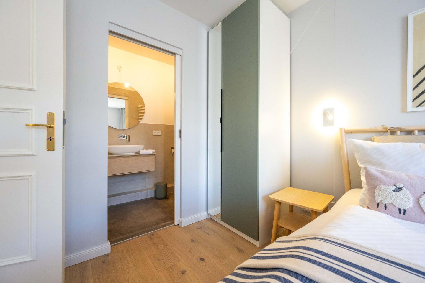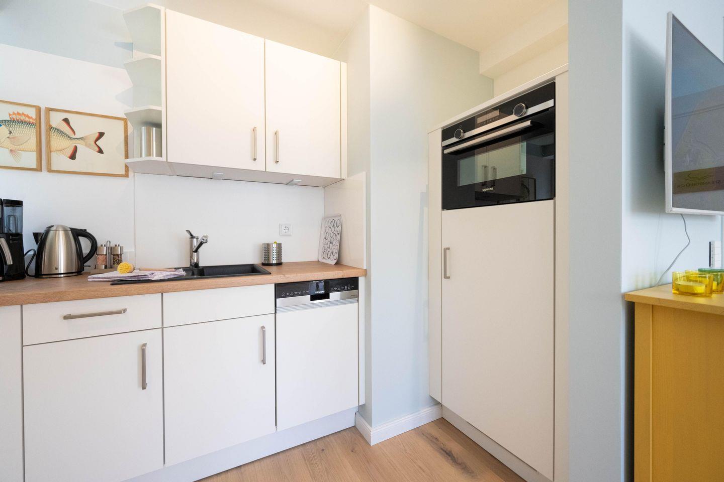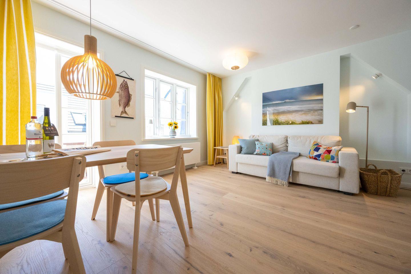 Die Ferienwohnung ist komplett im Obergeschoss gelegen und verfügt über einen Wohn- und Essbereich mit offener Küche, ein Schlafzimmer mit Doppelbett und ein Bad mit Raindance-Dusche. Über den Wohnbereich gelangen Sie auf den eigenen Balkon, der zur Promenade ausgerichtet ist. Ältere Kinder finden im Wohnraum einen gemütlichen Schlafplatz: Die große Couch lässt sich zu einem Bett ausklappen. Zu den Gemeinschaftsbereichen des Hauses zählen eine eigene Sauna, ein Fitnessraum sowie ein Fahrradunterstand mit E-Bike-Ladestationen im Innenhof.