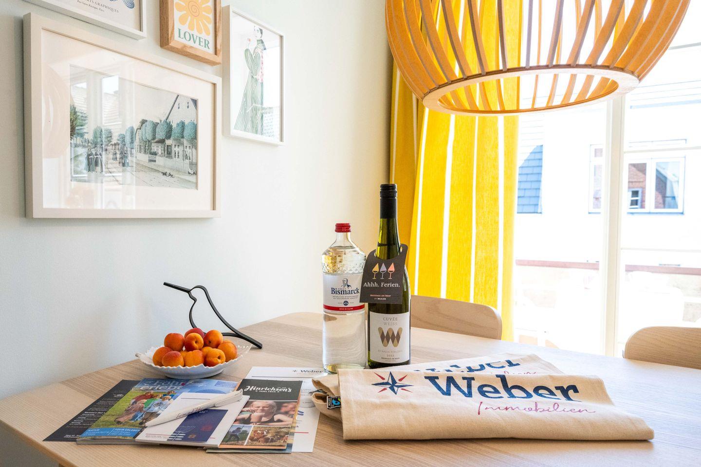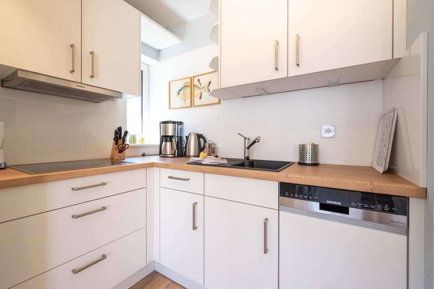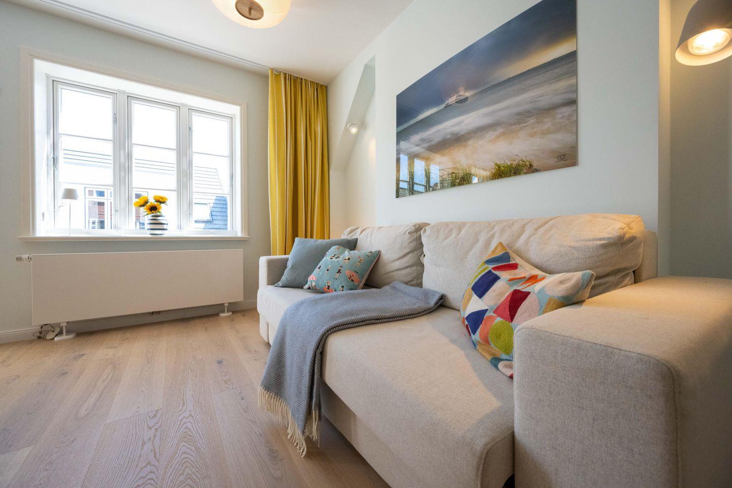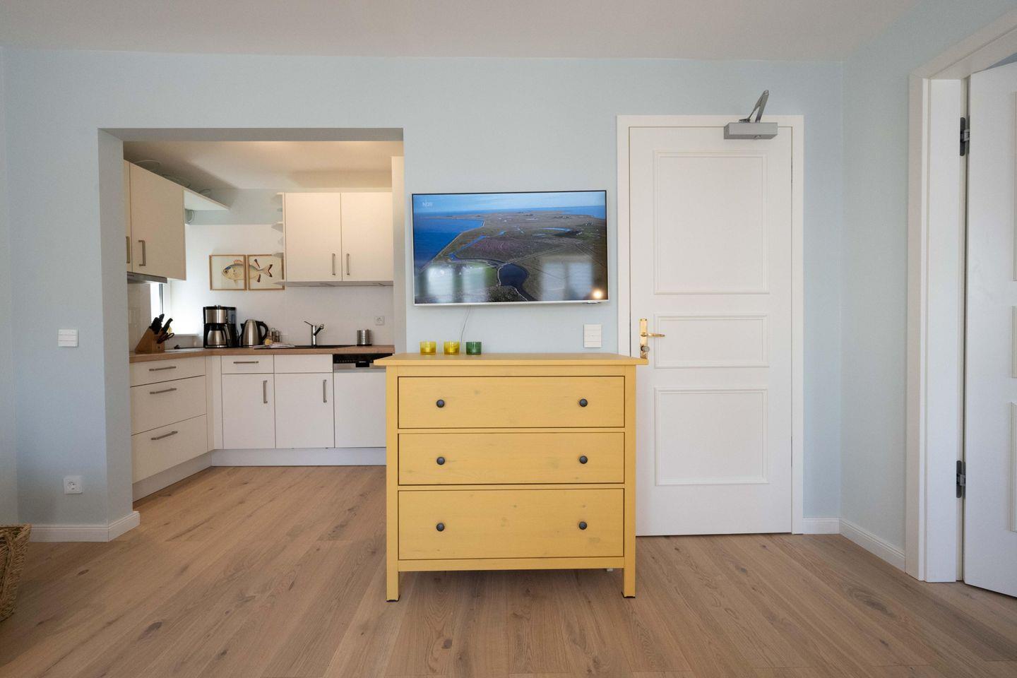 Die Ferienwohnung ist komplett im Obergeschoss gelegen und verfügt über einen Wohn- und Essbereich mit offener Küche, ein Schlafzimmer mit Doppelbett und ein Bad mit Raindance-Dusche. Über den Wohnbereich gelangen Sie auf den eigenen Balkon, der zur Promenade ausgerichtet ist. Ältere Kinder finden im Wohnraum einen gemütlichen Schlafplatz: Die große Couch lässt sich zu einem Bett ausklappen. Zu den Gemeinschaftsbereichen des Hauses zählen eine eigene Sauna, ein Fitnessraum sowie ein Fahrradunterstand mit E-Bike-Ladestationen im Innenhof.
