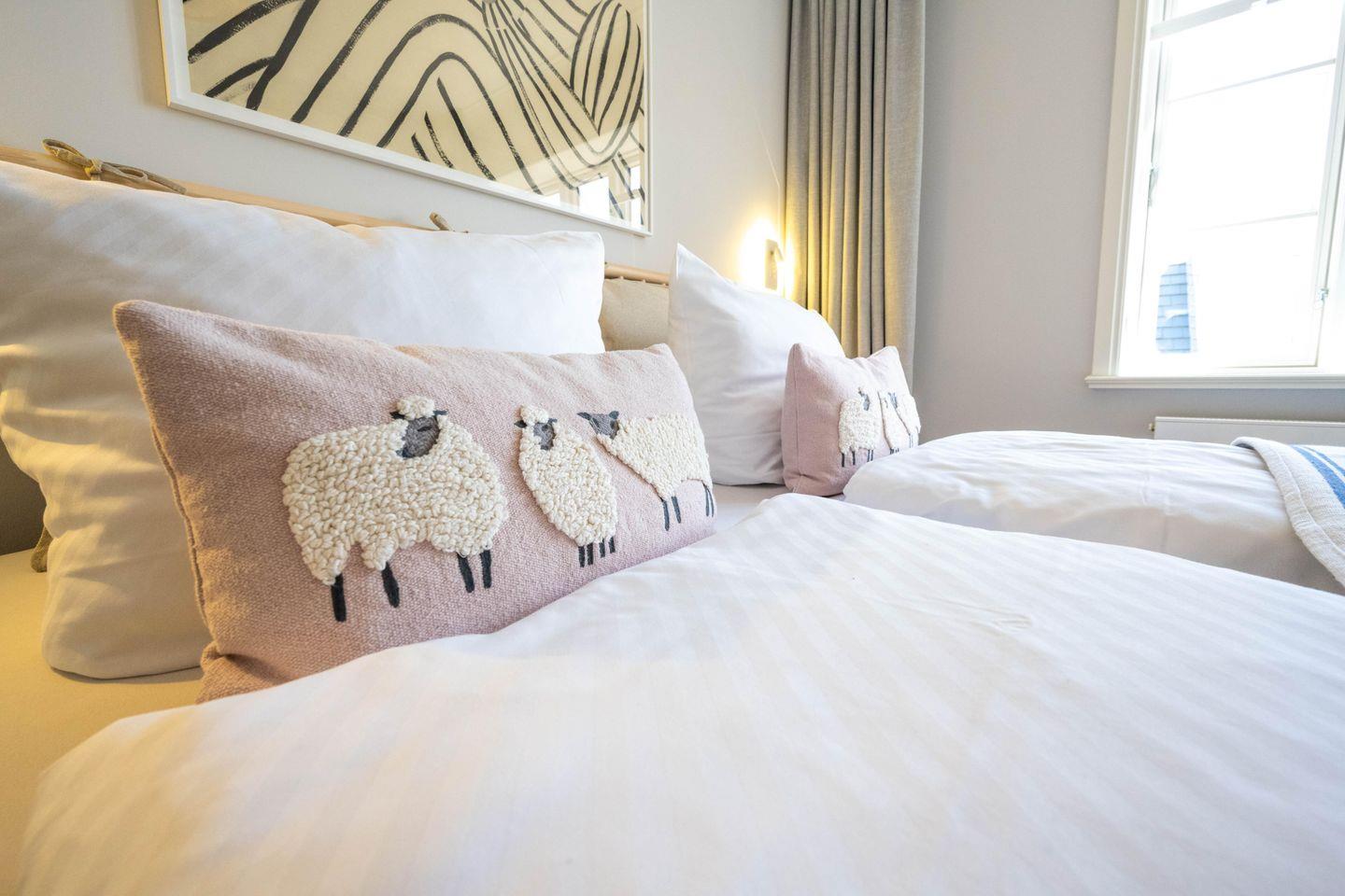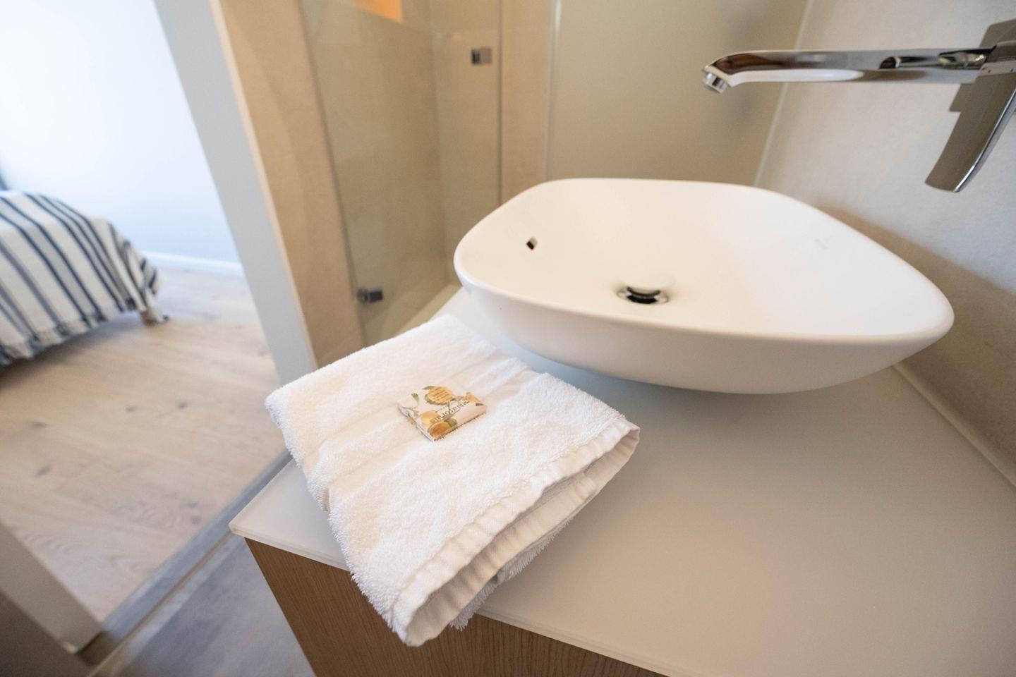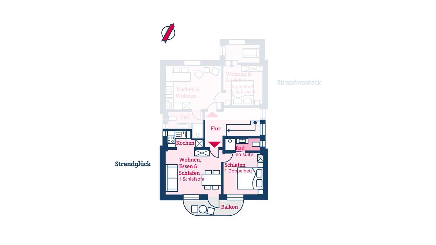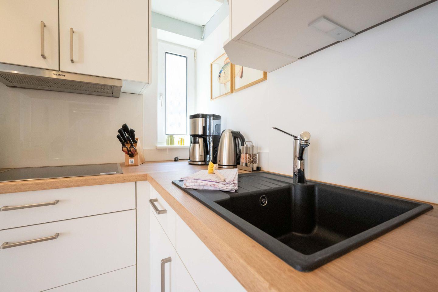 Die Ferienwohnung ist komplett im Obergeschoss gelegen und verfügt über einen Wohn- und Essbereich mit offener Küche, ein Schlafzimmer mit Doppelbett und ein Bad mit Raindance-Dusche. Über den Wohnbereich gelangen Sie auf den eigenen Balkon, der zur Promenade ausgerichtet ist. Ältere Kinder finden im Wohnraum einen gemütlichen Schlafplatz: Die große Couch lässt sich zu einem Bett ausklappen. Zu den Gemeinschaftsbereichen des Hauses zählen eine eigene Sauna, ein Fitnessraum sowie ein Fahrradunterstand mit E-Bike-Ladestationen im Innenhof.