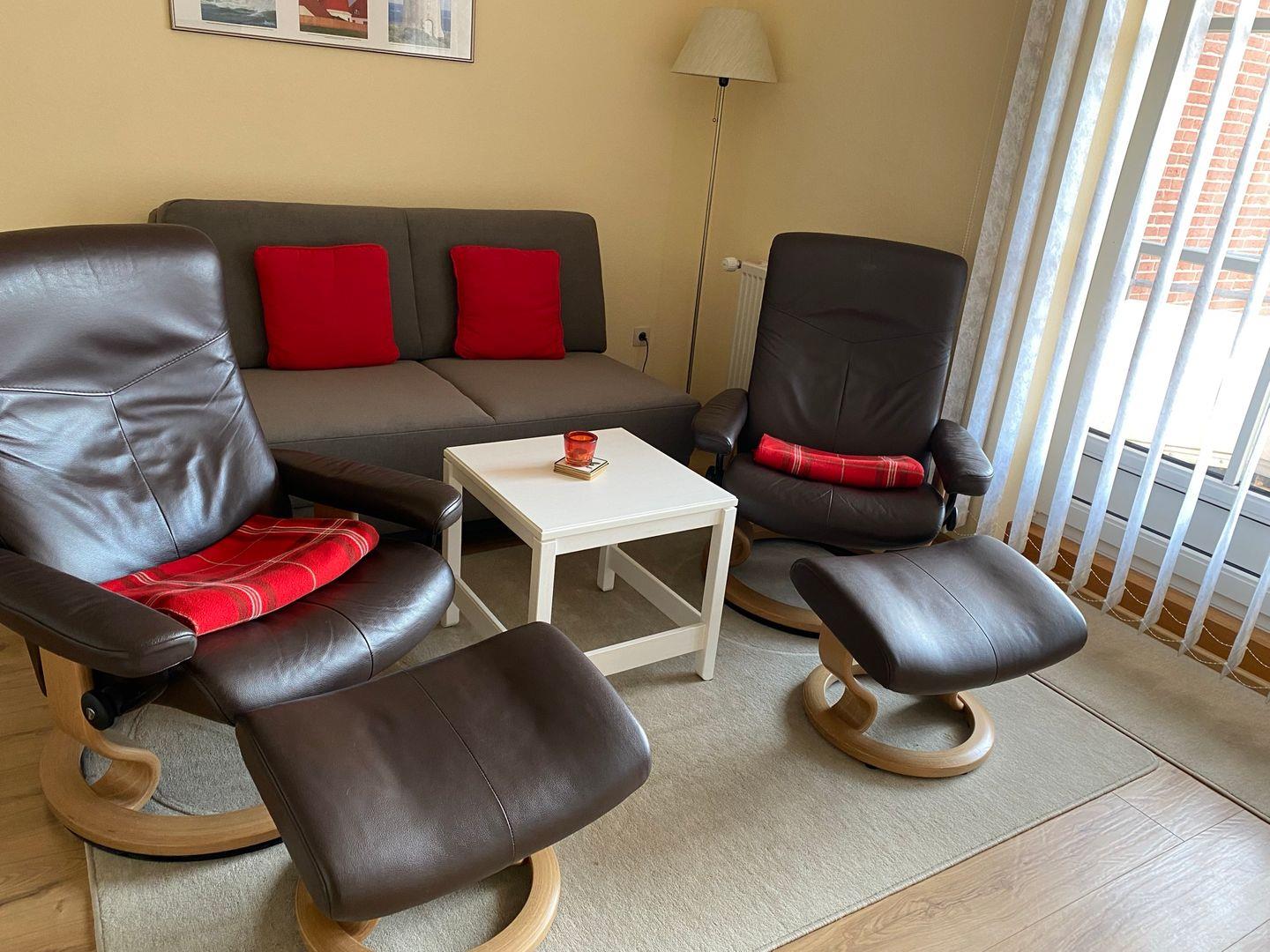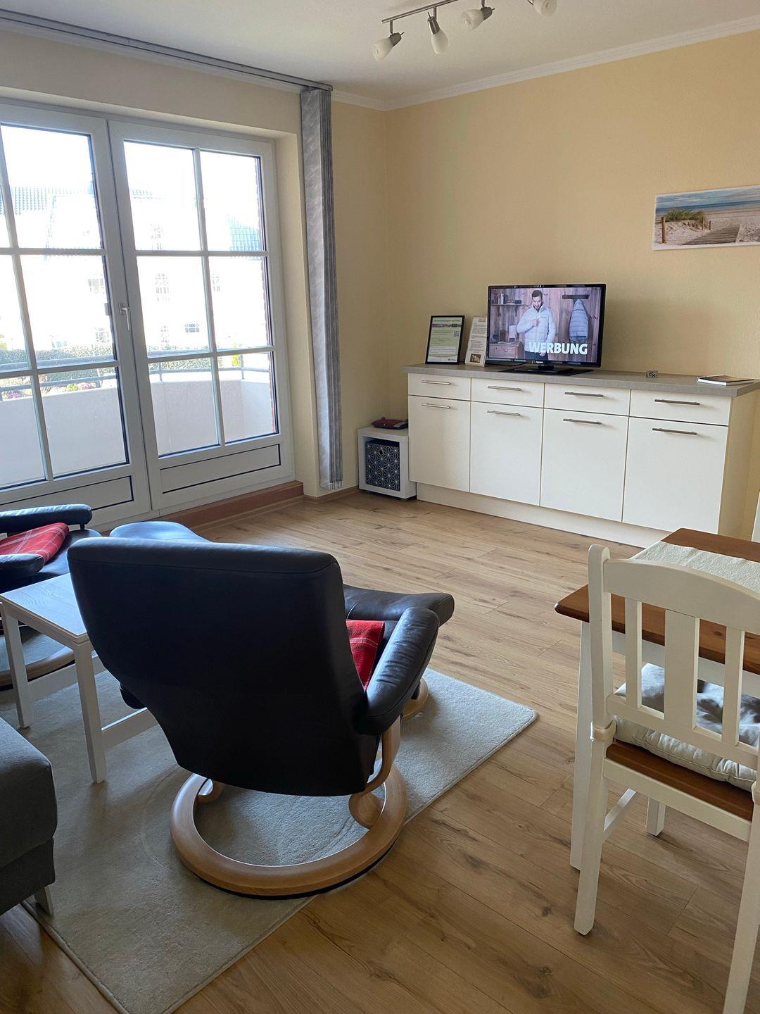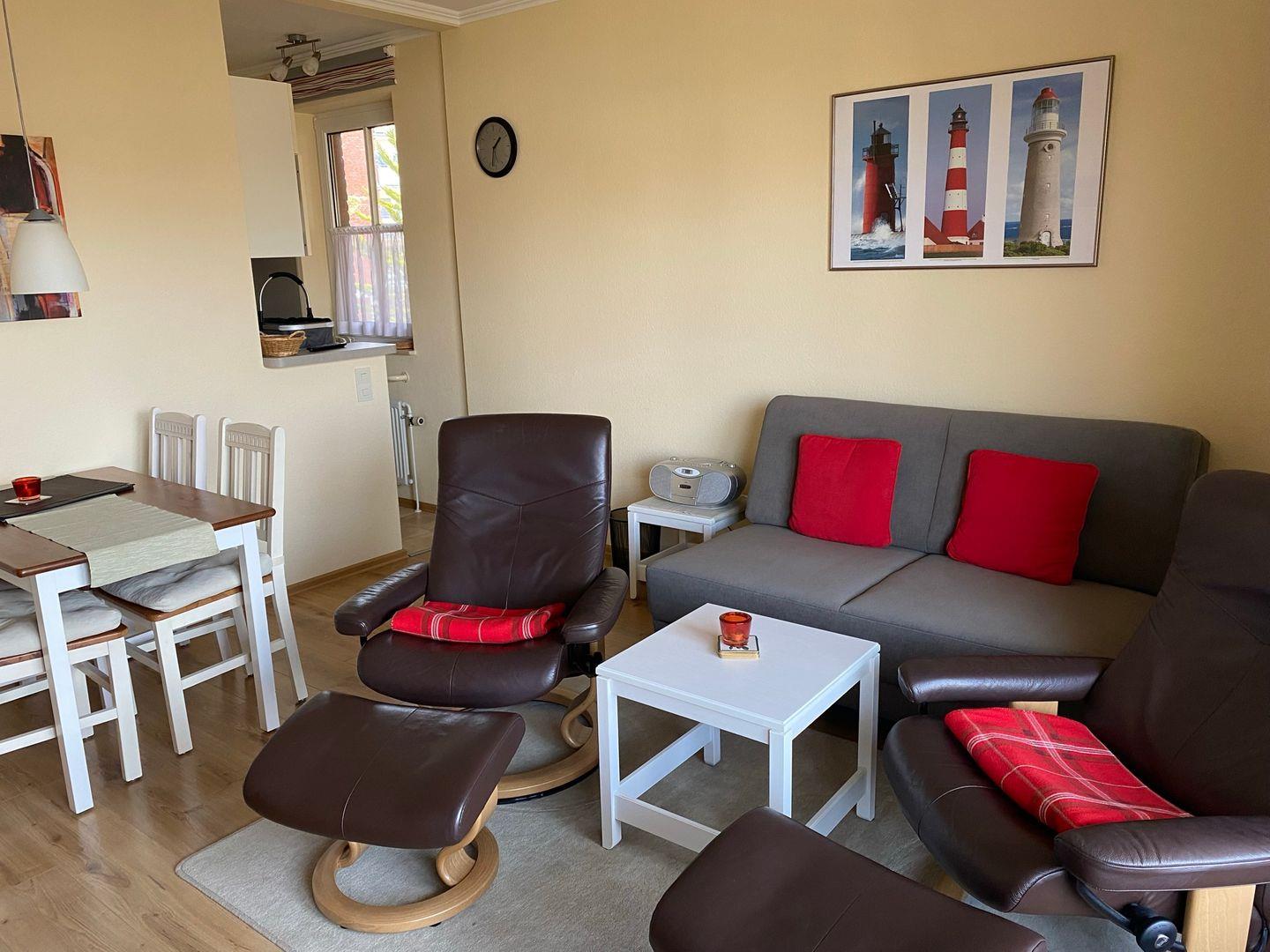 Erholsamer Urlaub an der Nordsee: Entspannung pur! Lassen Sie den Alltag hinter sich und genießen Sie erholsame Stunden in der liebevoll eingerichteten zwei-Zimmer-Wohnung in Nordseenähe. Die Wohnung ist komfortabel ausgestattet mit zwei Stressless Relaxsesseln und einem ausziehbaren Schlafsofa (neu im Frühjahr 2025). In der kleinen, modernen Küche finden Sie alles, was Sie für Ihren Aufenthalt benötigen. Im Doppelbett werden Sie gut schlafen und neue Kräfte für den nächsten Urlaubstag sammeln. Das Badezimmer hat eine Dusche mit hoher Duschwanne, ideal zum Entspannen nach einem Strandtag. Ob für einen Kurztrip oder einen längeren Urlaub – hier finden Sie Ruhe und Komfort in perfekter Kombination. Der möblierte Balkon ist überdacht, so dass Sie auch bei Regen draußen sitzen und Ihr Buch lesen können.