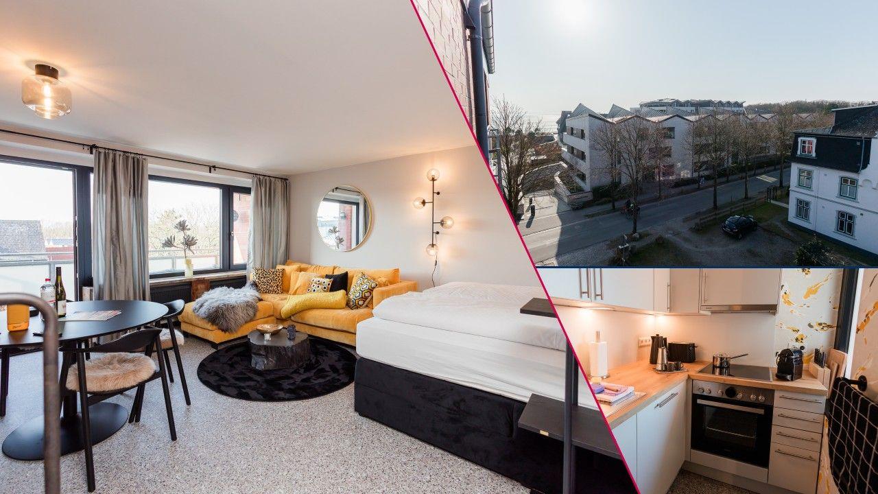 Strandnahe Ferienwohnung mit extravagantem Charme, mit seitlichem Meerblick vom eigenen Balkon.