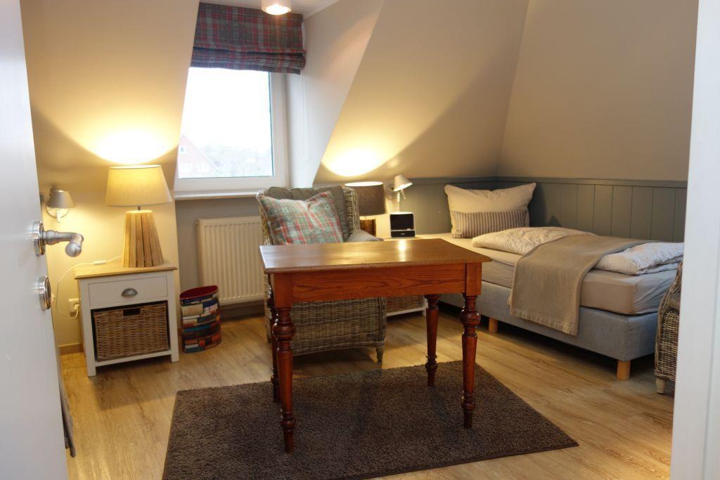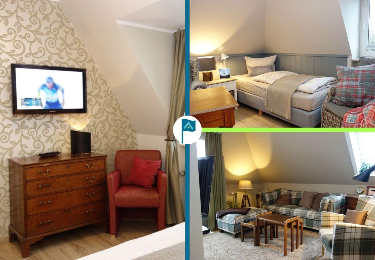 Stilvolle Obergeschosswohnung auf Föhr mit Strandkorb und moderner Ausstattung, ideal für bis zu vier Personen.