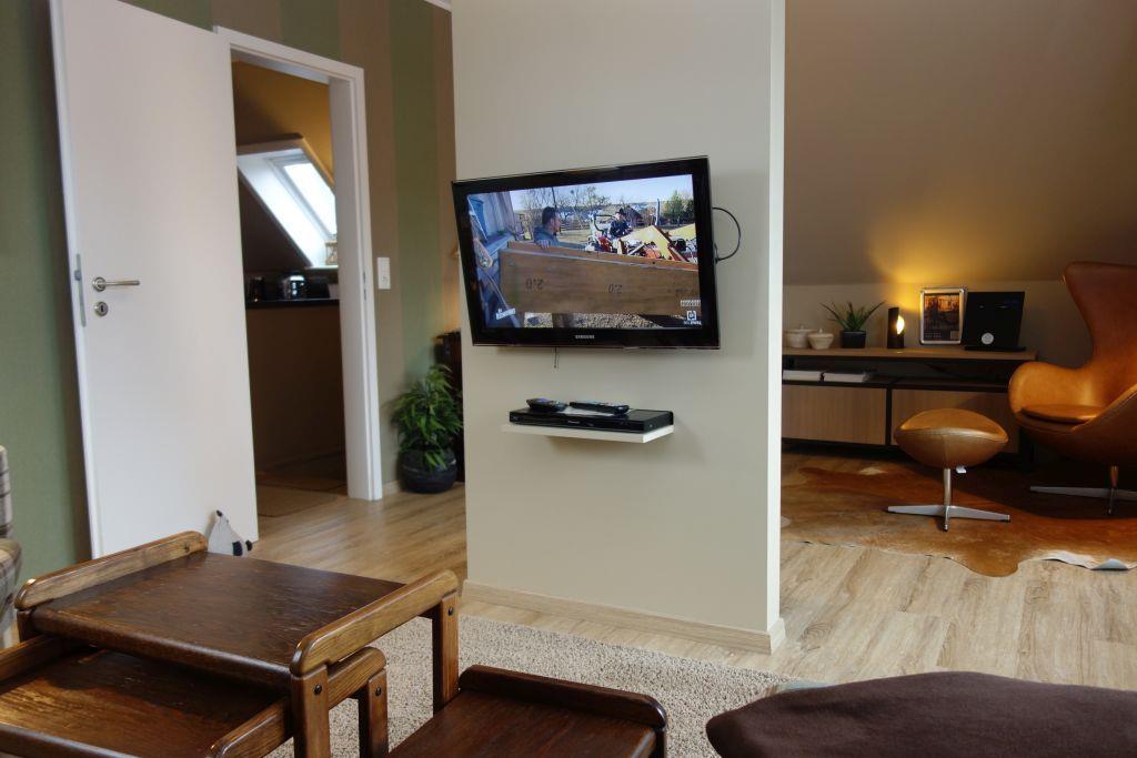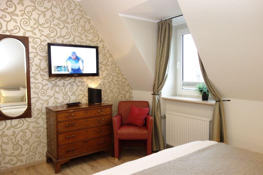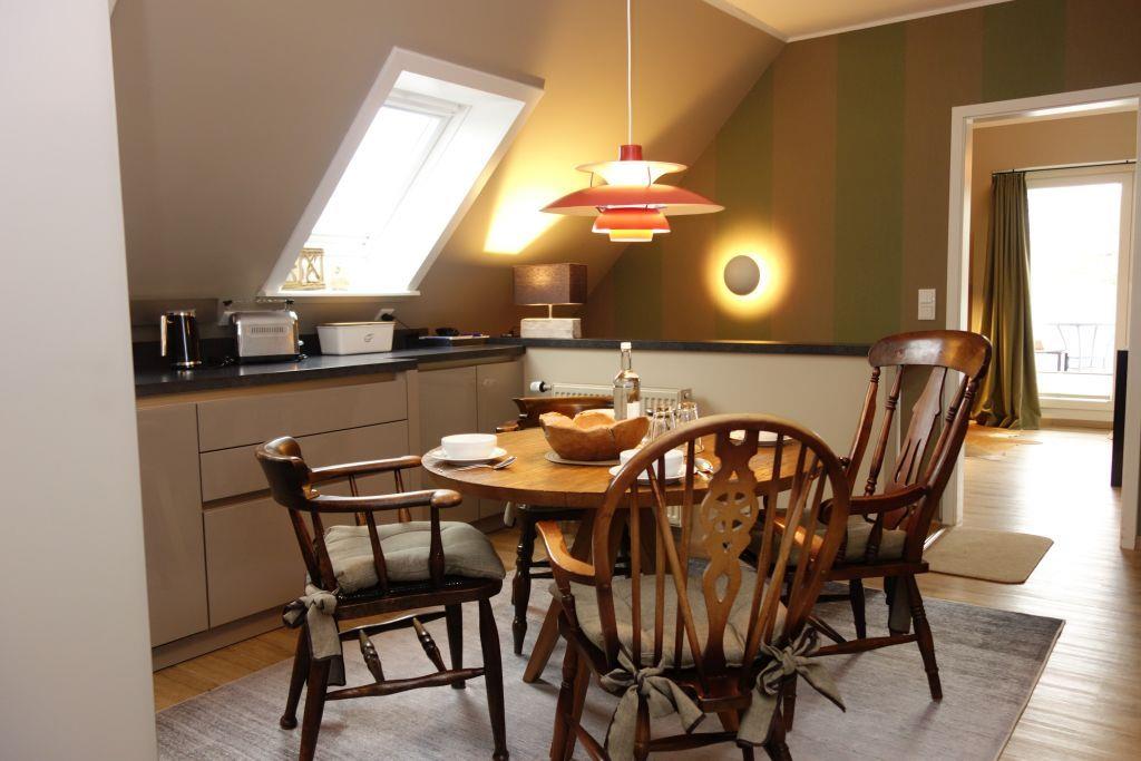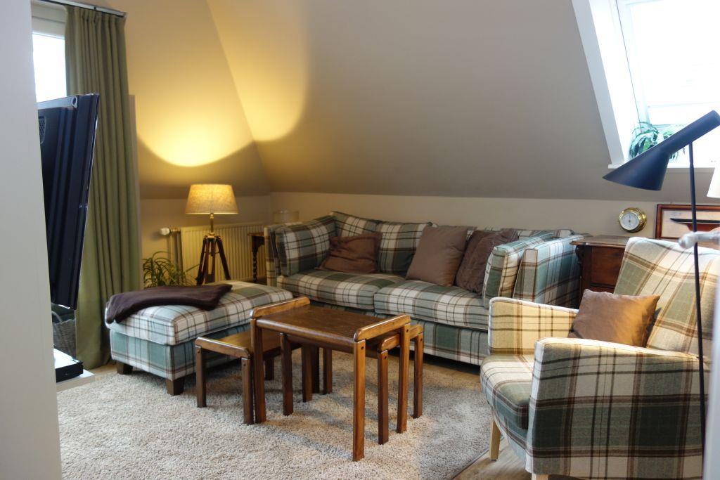Diese stilvolle und großzügige Obergeschosswohnung bietet Platz für bis zu vier Personen und vereint Komfort mit Gemütlichkeit. In der modernen Küche lädt ein einladender Essbereich zu gemeinsamen Mahlzeiten ein, während das zweigeteilte Wohnzimmer sowohl eine gemütliche Leseecke als auch einen separaten TV-Bereich bereithält – perfekt, um individuelle Wohlfühlmomente zu genießen.
