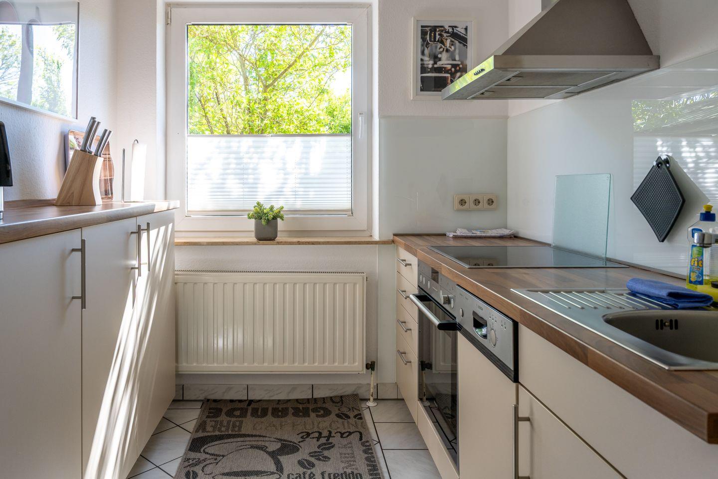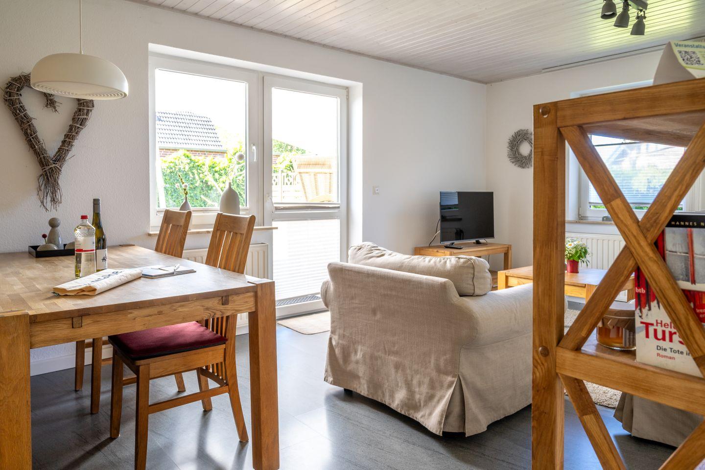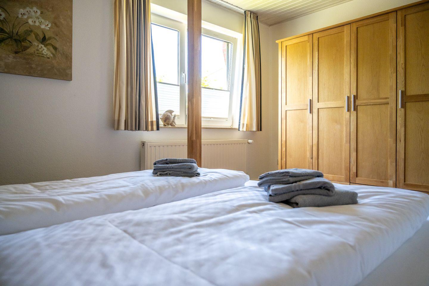 Die Wohnung liegt vollständig im Erdgeschoss und unterteilt sich in einen Wohn- und Essbereich mit separater Küche, zwei Schlafzimmer und ein Duschbad. Über den Wohnbereich gelangen Sie direkt auf die Terrasse und in den eigenen Gartenabschnitt. Die Schlafzimmer sind mit einem Doppelbett bzw. zwei Einzelbetten ausgestattet.