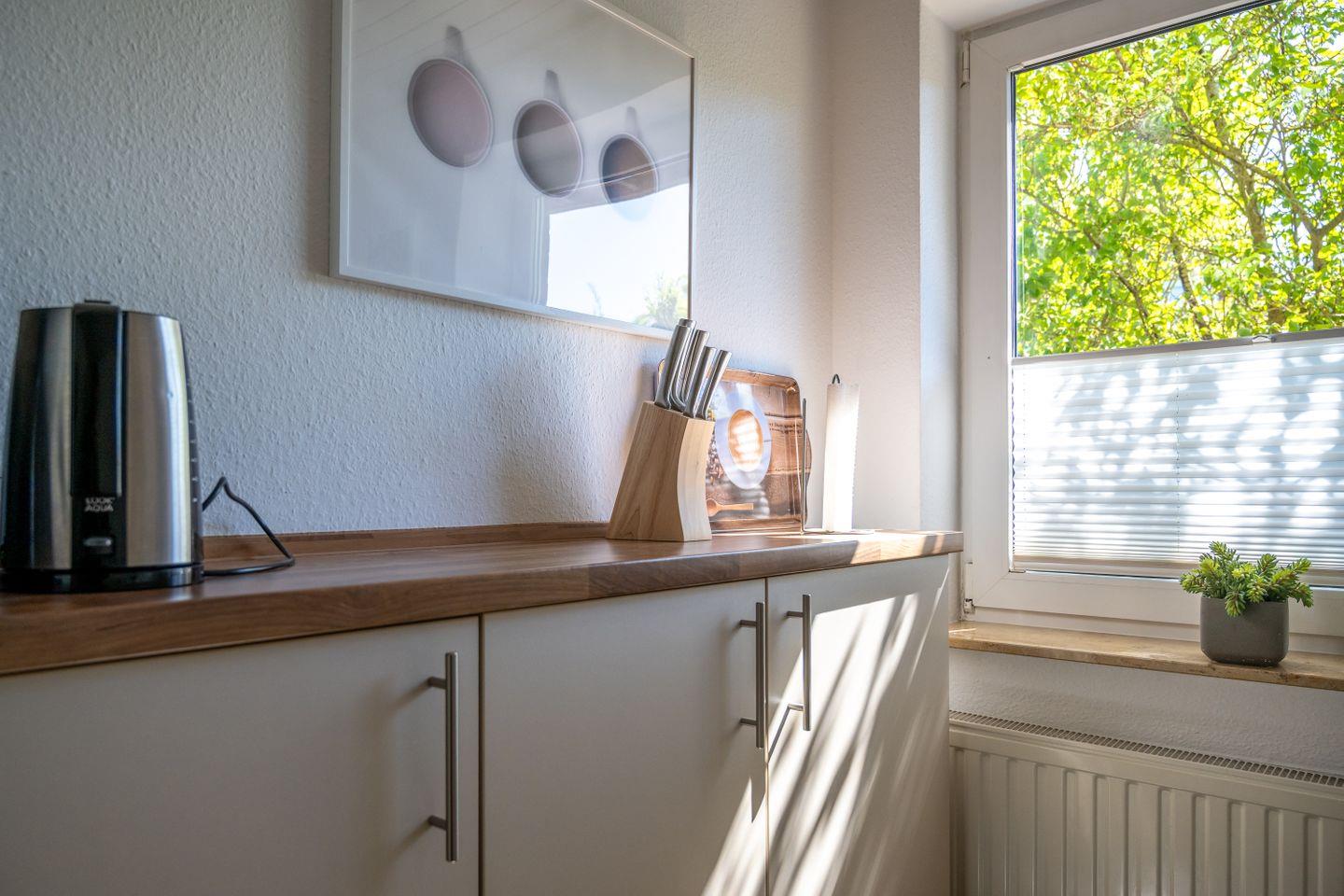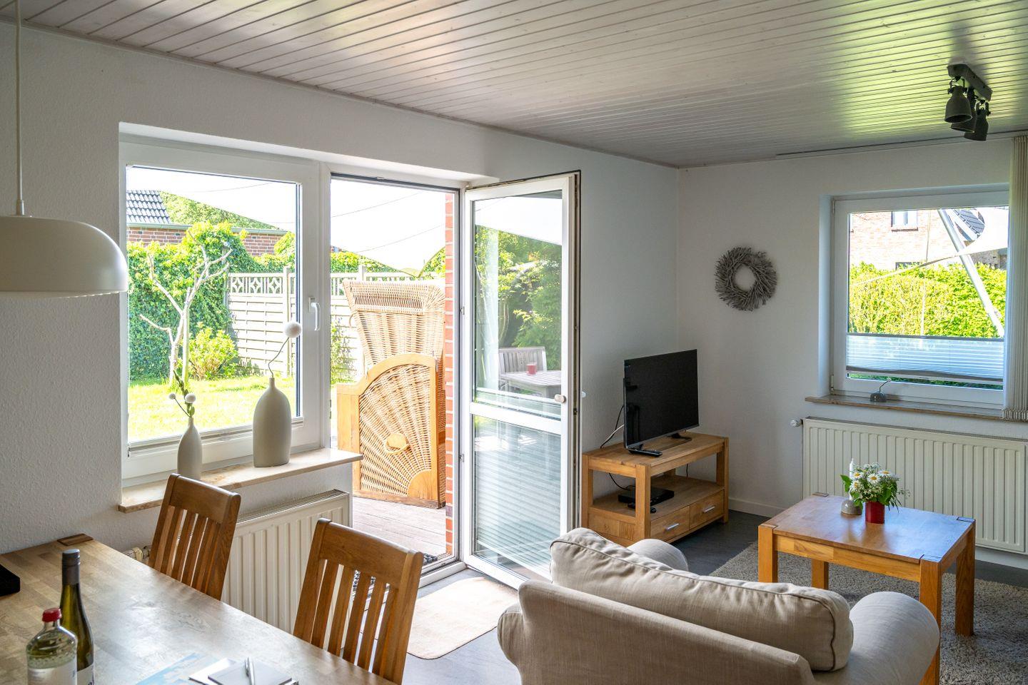 Zu den Highlights der Ferienunterkunft zählen wir u. a. den eigenen, eingezäunten Garten mit Terrasse und Strandkorb sowie die zentrumsnahe Lage.