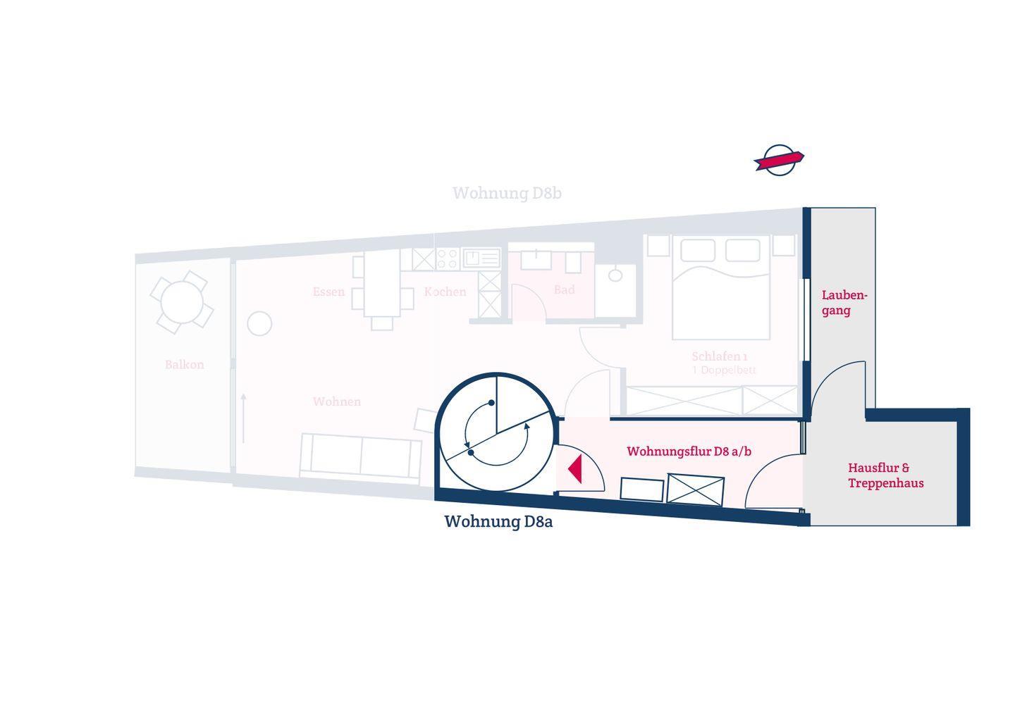 Die Gäste der Wohnungen D8a und D8b teilen sich einen gemeinsamen Hausflur. Zu den Gemeinschaftsbereichen zählen das Schwimmbad und die Sauna im Souterrain - ein echtes Highlight!