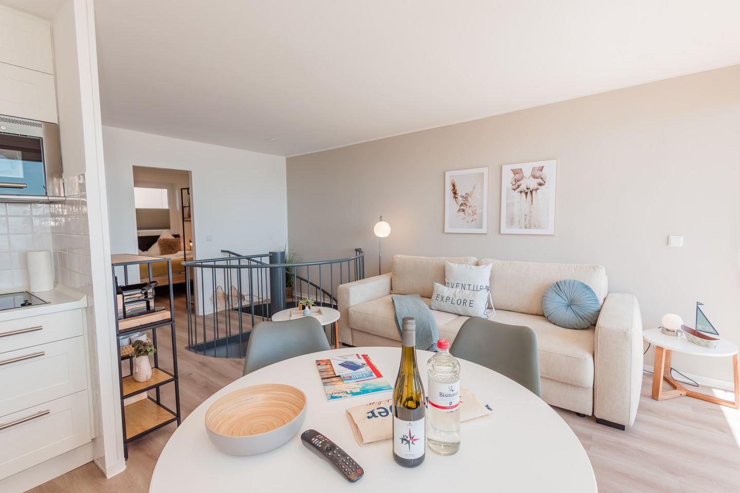 Die Wohnung liegt vollständig im 3. Obergeschoss und unterteilt sich in einen großzügigen Wohn- und Essbereich mit offener Küche, ein Schlafzimmer mit Doppelbett, ein Schlafzimmer mit Einzelbett und ein Duschbad. Über den Wohnbereich gelangen Sie direkt auf den eigenen Balkon mit traumhaft schönem Meerblick.