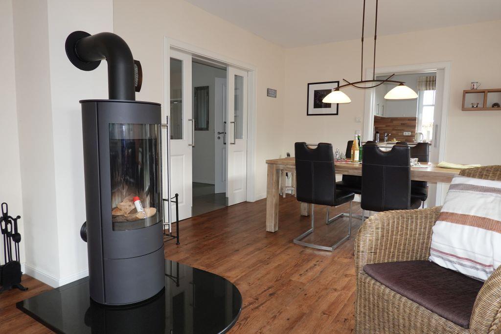 Die Innenausstattung von Haus Achtundzwanzig überzeugt durch eine Kombination aus stilvoller Geradlinigkeit und Funktionalität. Im Wohnzimmer, das mit einem wertigen Parkettboden ausgestattet ist, erwartet Sie ein Kaminofen, der insbesondere in den Abendstunden eine angenehme Atmosphäre schafft. Zwei komfortables Sofas, Sessel sowie ein moderner Fernseher (insgesamt verfügt das Haus über vier TV-Geräte mit digitalem Anschluss) und ein DVD- sowie CD-Spieler bieten unterschiedliche Möglichkeiten der Unterhaltung. Auch Bücher für gemütliche Lesestunden sind vorhanden.