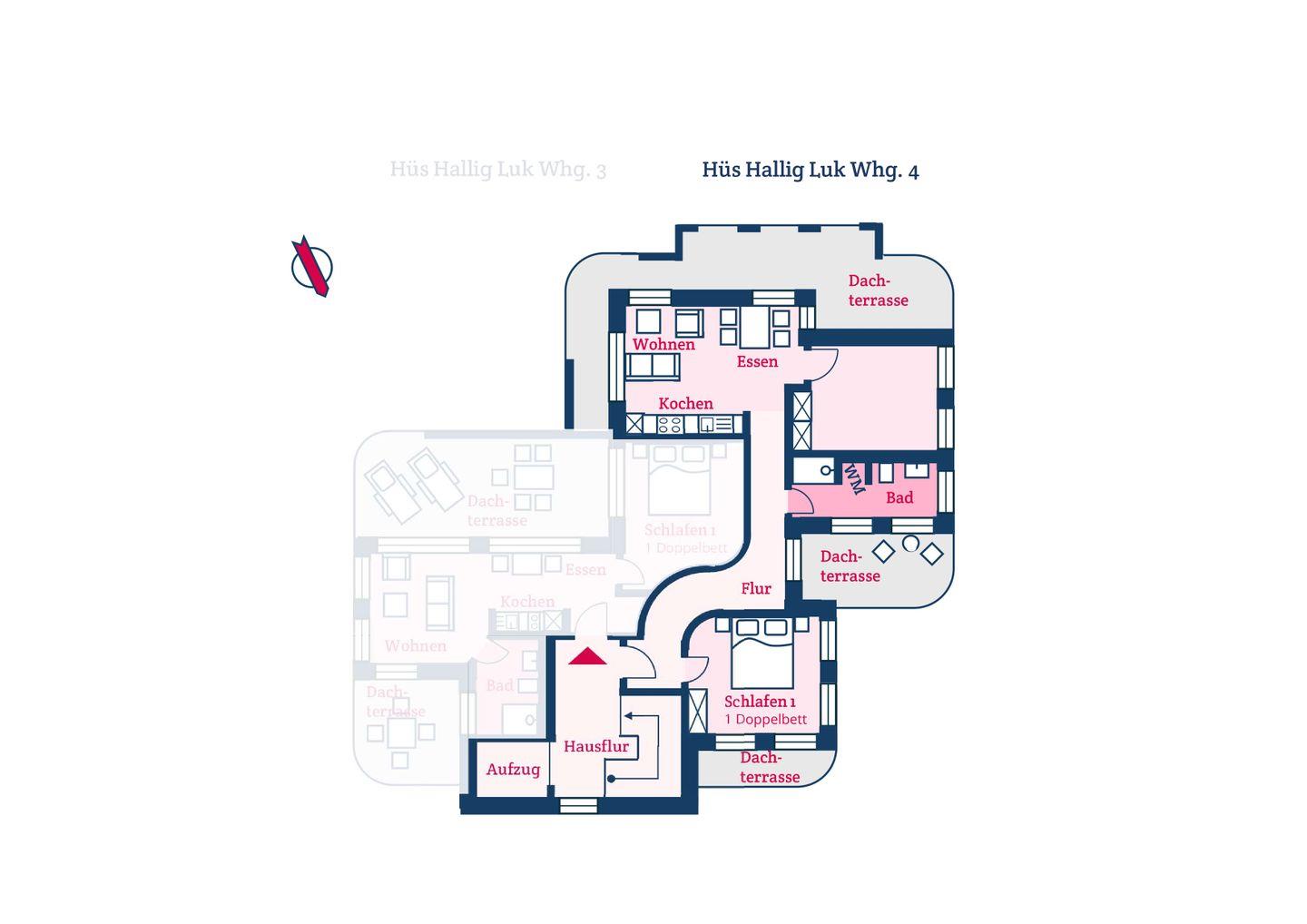 Die hochwertig eingerichtete Wohnung ist vollständig im Penthouse-Geschoss gelegen und über einen Aufzug zu erreichen. Sie unterteilt sich in einen großzügigen Wohn- und Essbereich mit offener Küche, ein Schlafzimmer mit Nordwest-Dachterrasse und ein Duschbad mit Waschmaschine. Das Schlafzimmer ist mit einem Doppelbett und einem Smart-TV ausgestattet. Über den Wohnbereich gelangen Sie auf die zweite, südwestlich ausgerichtete Dachterrasse. Über den Flur und das Duschbad gelangen Sie auf die dritte Dachterrasse, ebenfalls in Nordwest-Ausrichtung.