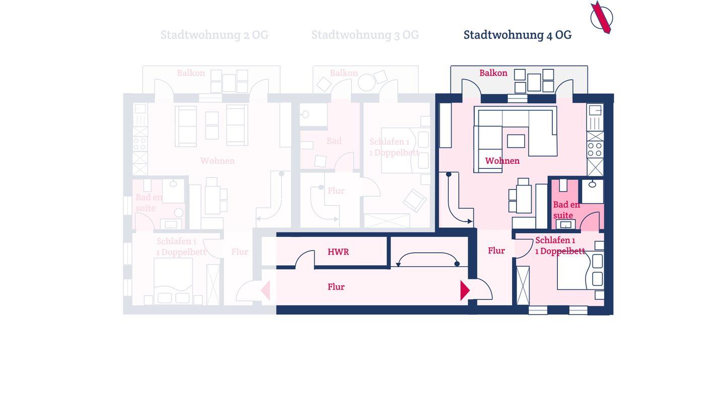 Die Wohnung 4 liegt in der 1. Etage rechts des Hauses Stadtwohnungen 10A. Sie verfügt über ein großzügiges Wohn / Esszimmer mit einer Küchenzeile mit Einbauküche, 3 separate Schlafräume, 2 Bäder und einen Süd-Balkon. Zudem stehen 8 videoüberwachte PKW- Stellplätze für 9 Stadtwohnungen direkt am Haus zur Verfügung. Die Stadtwohnungen liegen zentral aber dennoch nur 200 m vom Strand entfernt.