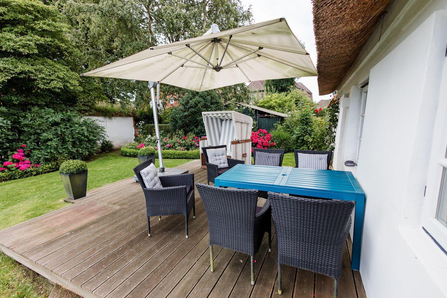 Luxuriöses Reetdachhaus mit Garten und Strandkorb in ruhiger Lage auf Föhr.