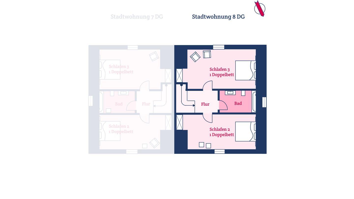 Die Wohnung 8 liegt rechts in der 1. Etage des Hauses. Sie verfügt über ein großzügiges Wohn-/Esszimmer mit einer Küchenzeile mit Einbauküche, 3 separate Schlafräume, 2 Bäder und einen Süd-Balkon. Zudem stehen 8 videoüberwachte PKW- Stellplätze für 9 Stadtwohnungen direkt am Haus zur Verfügung. Die Stadtwohnungen liegen zentral, aber dennoch nur 200m vom Strand entfernt.