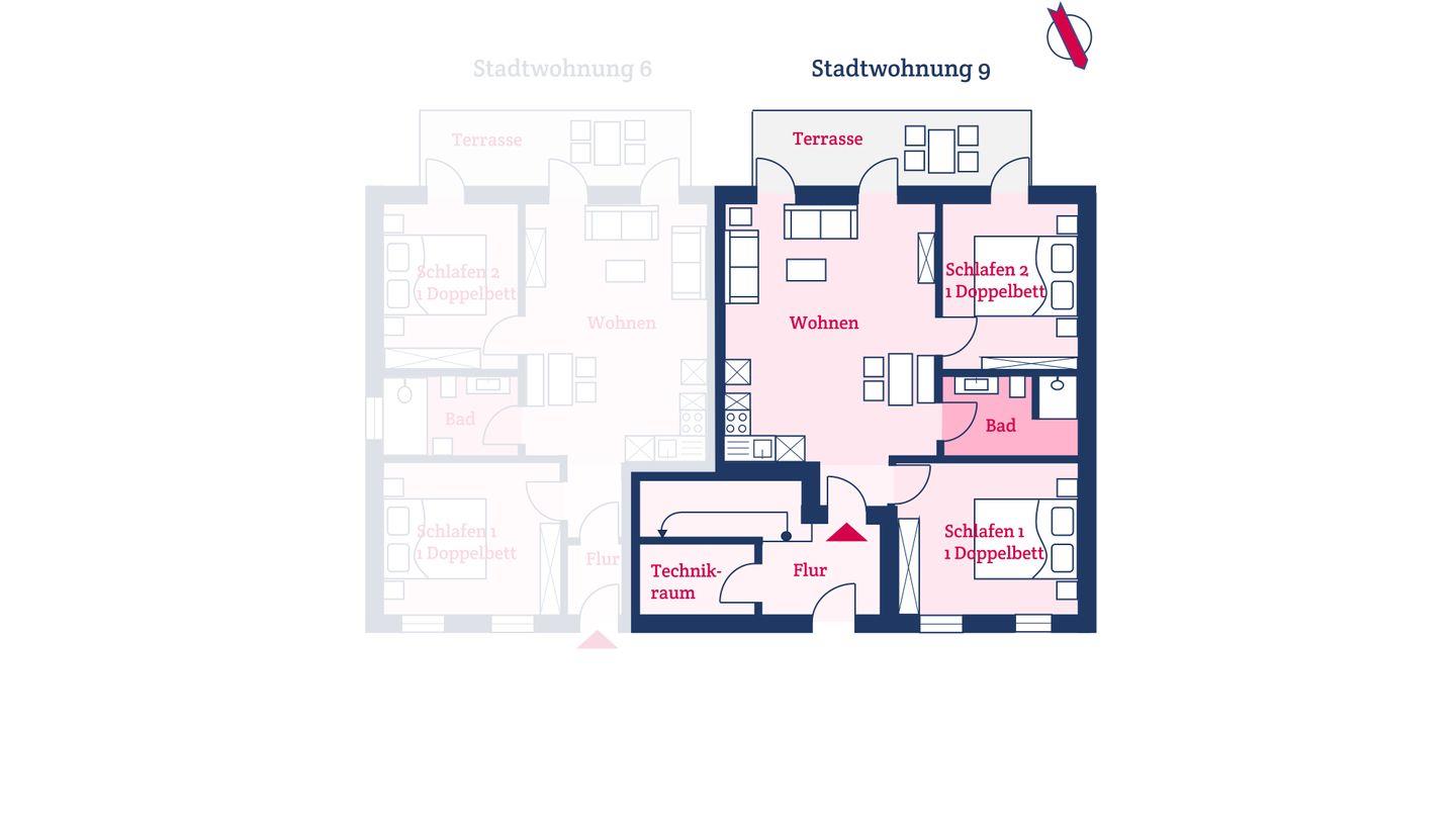 Die Stadtwohnung 9 liegt rechts im Erdgeschoss des Hauses. Sie verfügt über ein kombiniertes Wohn-/Esszimmer mit einer Küchenzeile mit Einbauküche, 2 separate Schlafräume, ein Duschbad und eine Süd-Terrasse nebst Garten. Zudem stehen 8 videoüberwachte PKW- Stellplätze für 9 Stadtwohnungen direkt am Haus zur Verfügung. Waschmaschine und Trockner stehen Ihnen im Hauswirtschaftsraum des Hauses 10a zur Verfügung. In den gemeinsamen Bereichen des Hauses finden Sie außerdem diverse Brettspiele, Bücher sowie Prospekte und Kaffeepad- und Kapselmaschinen, die Sie sich für Ihren Aufenthalt gerne mit in Ihre Stadtwohnung nehmen können.