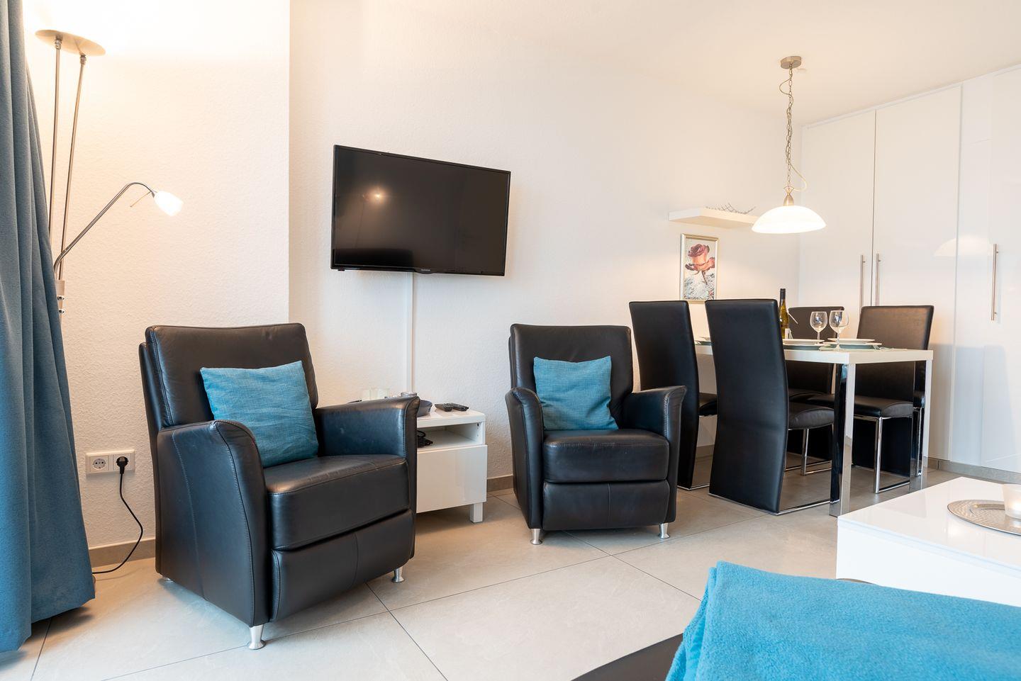 Das 2-Zimmer-Quartier Jütland für bis zu drei Personen (plus evtl. Haustier) mit ca. 46 m² Grundfläche besteht aus einem großen Wohnzimmer mit Echtleder-Schlafsofa und Essecke, einer separaten, kleinen Küche und einem Schlafzimmer mit Vollholzmöbeln aus Wildbuche. Zudem verfügt die Wohnung über eine Fußbodenheizung.