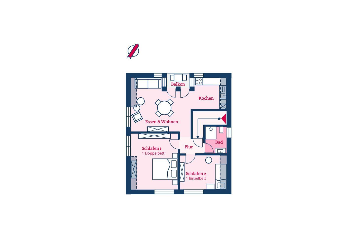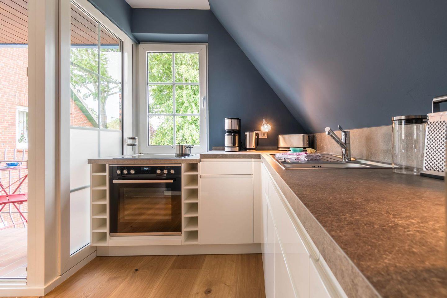 Die Ferienwohnung Leo und Lotte befindet sich im Obergeschoss. Ein Handlauf begleitet Sie sicher und bequem nach oben. Die Wohnung verfügt über einen offenen Wohn- und Essbereich mit integrierter Küche sowie zwei Schlafzimmern und einem Badezimmer. Die Küche ist mit namenhaften Markengeräten ausgestattet und sehr gut ausgestattet. Die hell eingerichteten Schlafzimmer werden Sie begeistern. Das Kinderzimmer ist mit einem Einzelbett ausgestattet und das Elternschlafzimmer mit einem Doppelbett. Beide Schlafzimmer verfügen über ausreichend Stauraum. Von dem offenen Wohn- und Essbereich gelangen Sie direkt auf den wohnungseigenen Balkon.
