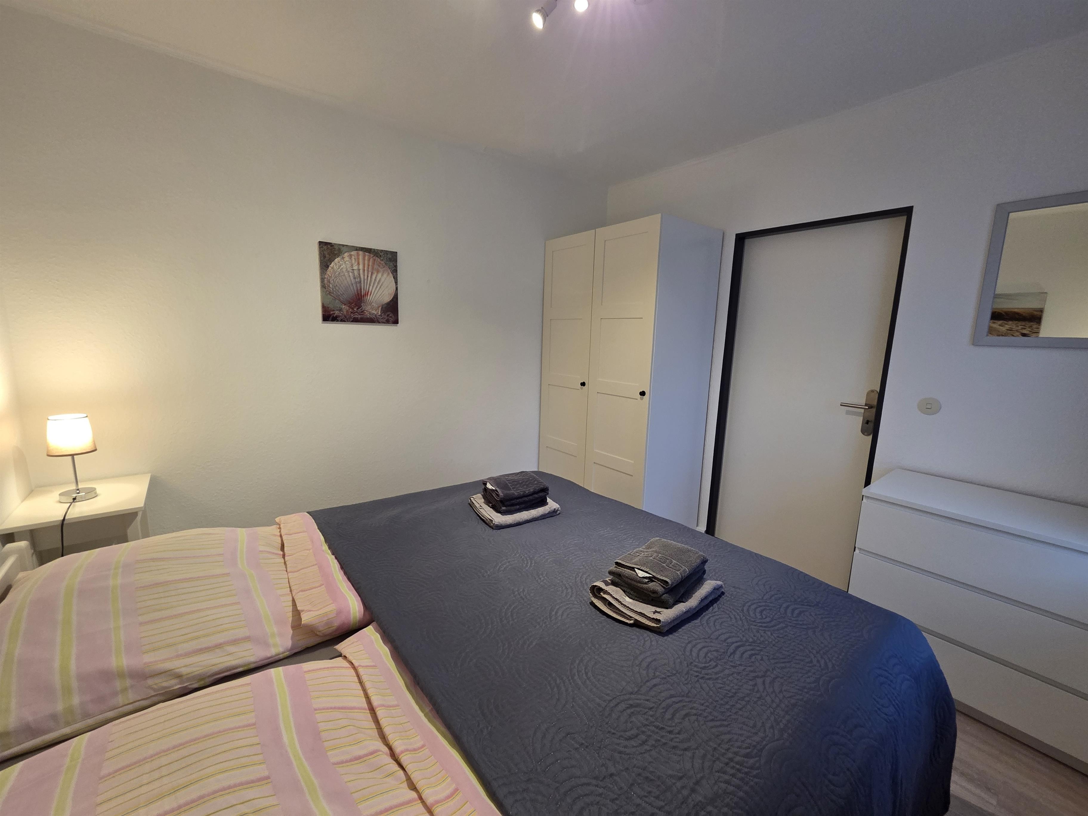 Das Schlafzimmer ist mit einem Doppelbett (1,80 × 2,00 m) sowie einem Kleiderschrank ausgestattet.