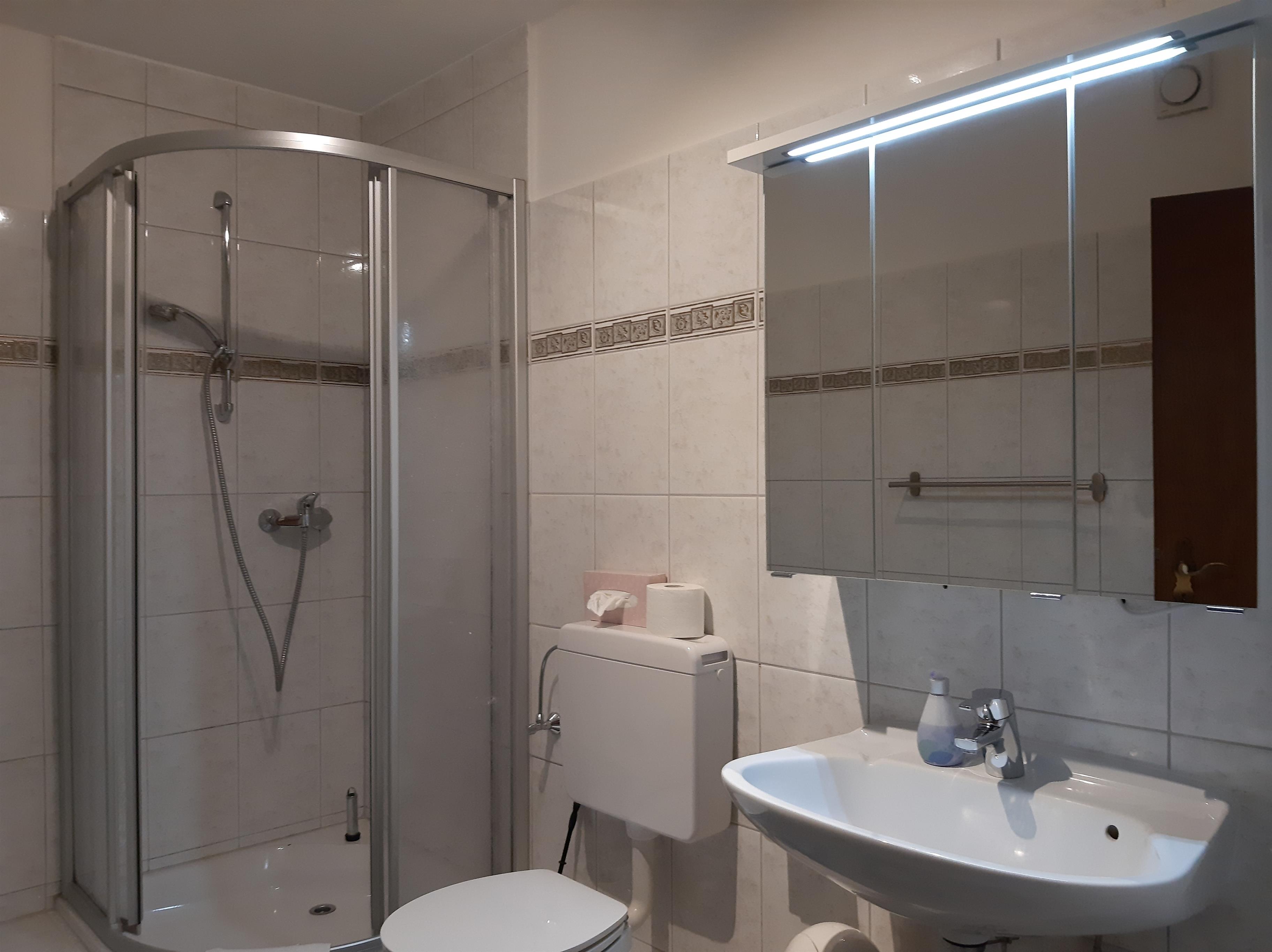 Im Badezimmer befinden sich Dusche, WC, Waschbecken sowie ein Föhn.