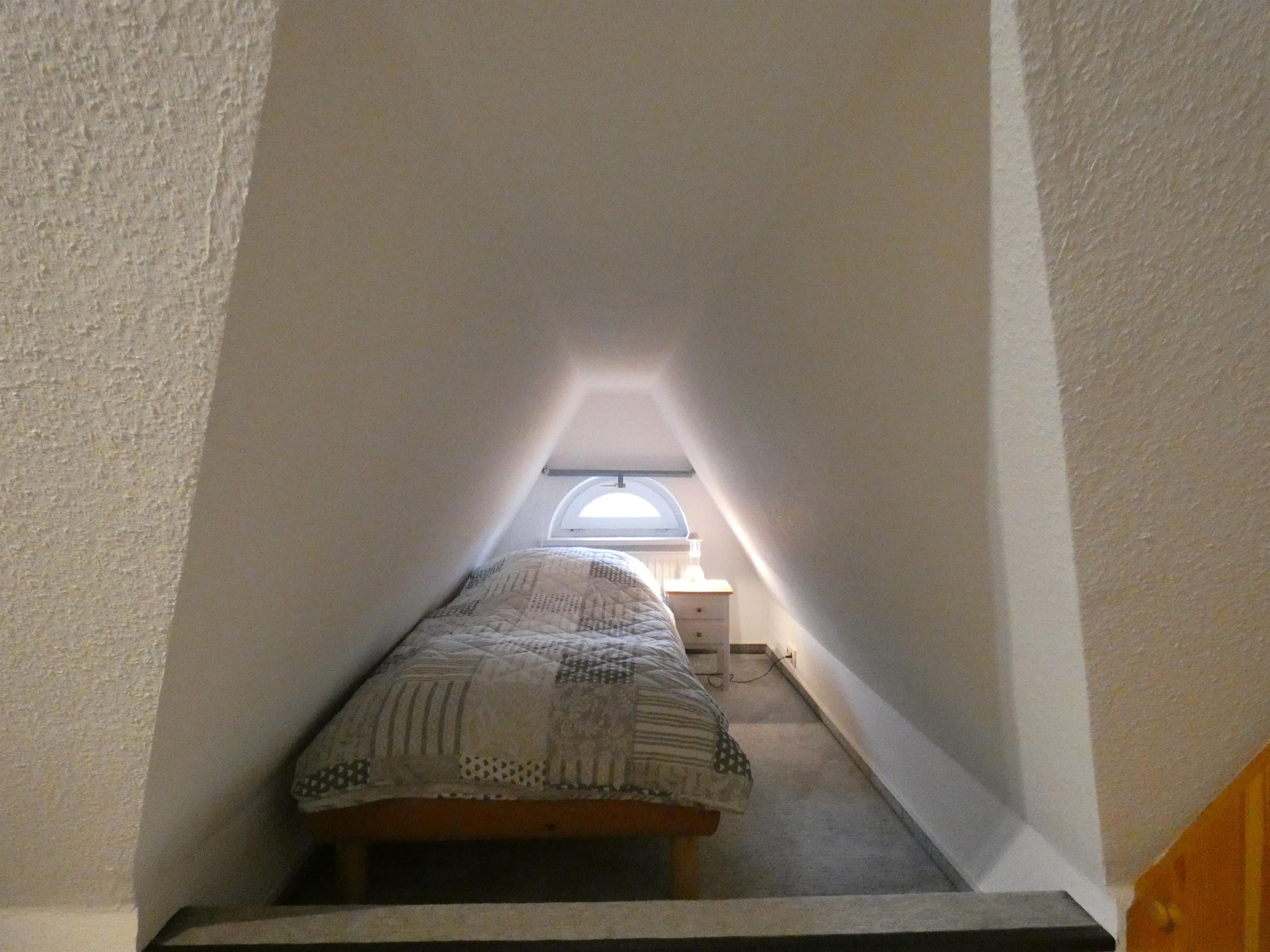 Über eine Treppe im Wohnzimmer gelangen Sie in den ausgebauten Spitzboden. Hier befinden sich drei Einzelbetten (je 0,90 × 2,00 m) sowie ein kleiner Kleiderschrank. Aufgrund der Dachschrägen ist die Raumhöhe in diesem Bereich teilweise niedriger.