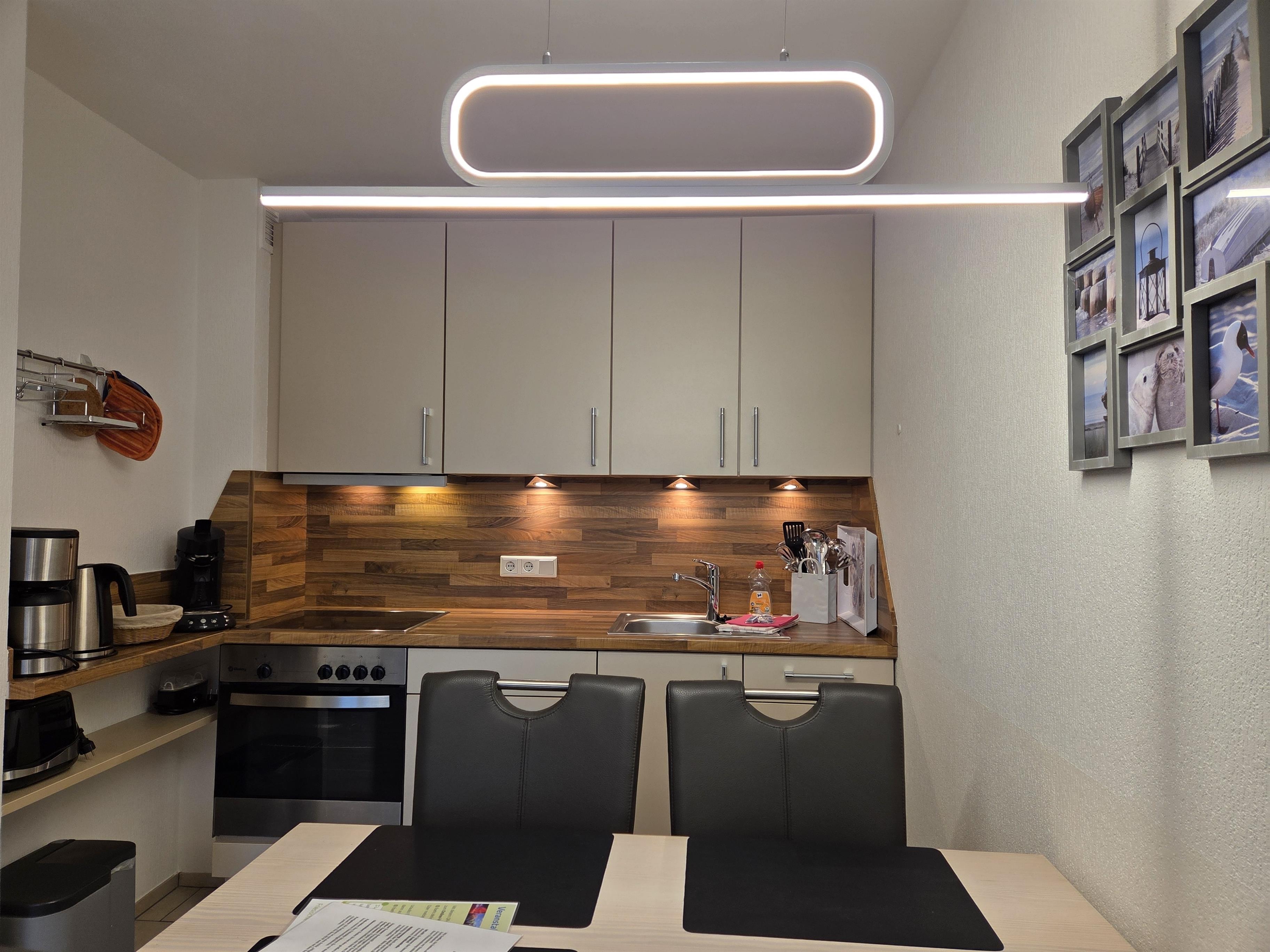 Der großzügige Wohn- und Essbereich mit gut ausgestatteter Einbauküche bildet das Herzstück der Wohnung. Von hier aus gelangen Sie direkt auf den sonnigen Südbalkon, der sich ideal für entspannte Stunden nach einem Strandtag eignet.