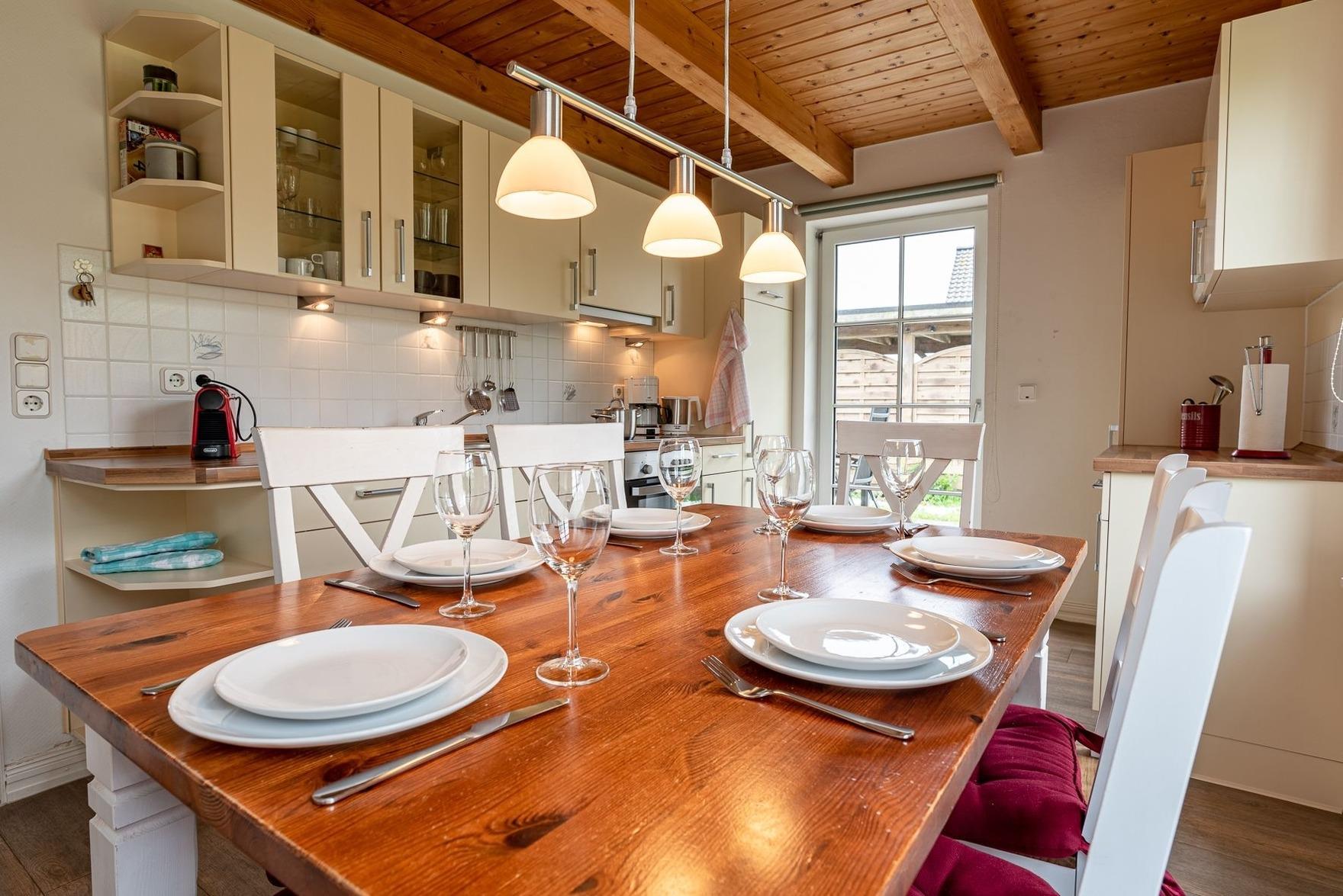Einen großen Wohn-Essbereich und eine separate Küche mit einem Essplatz.