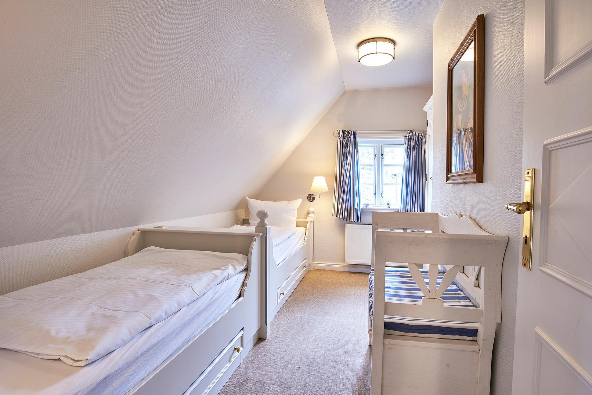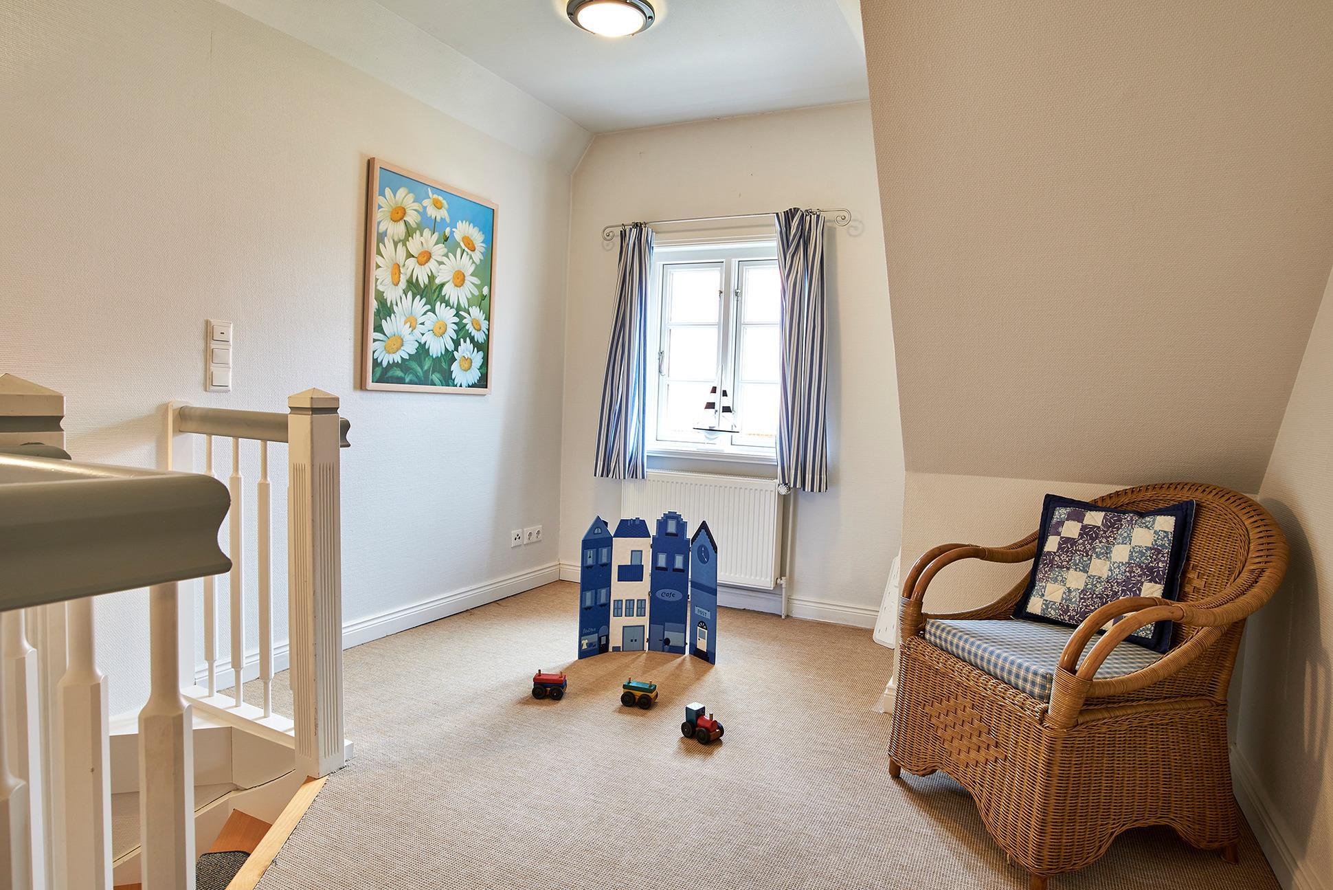 Das Obergeschoss verfügt über zwei Schlafzimmer: 1 Doppelbett im Elternschlafzimmer, 2 Einzelbetten im Stil von Alkoven im Kinderzimmer sowie eine kleine Spielgalerie im Flur laden zum Verweilen ein. Das Duschbad ist mit WC und Bidet ausgestattet. Das gesamte Mobiliar ist hochwertig und sehr liebevoll zusammengestellt. Auf der Süd-Terrasse, mit bequemen Möbeln und Strandkorb, kann man die Stunden im Freien genießen. Dabei wünschen wir Ihnen bereits jetzt viel Vergnügen und hoffen, dass die Nordseeluft und das Wetter dazu beitragen!