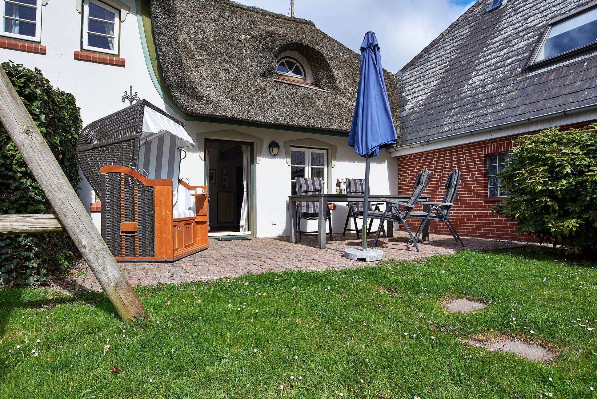 Charmantes Ferienhaus Inga in Wyk-Boldixum mit Reetdach, Terrasse, Gemeinschaftsgarten und moderner Ausstattung für erholsame Nordseeferien.
