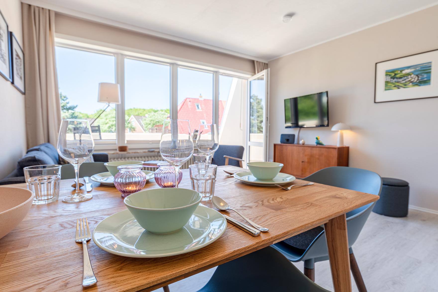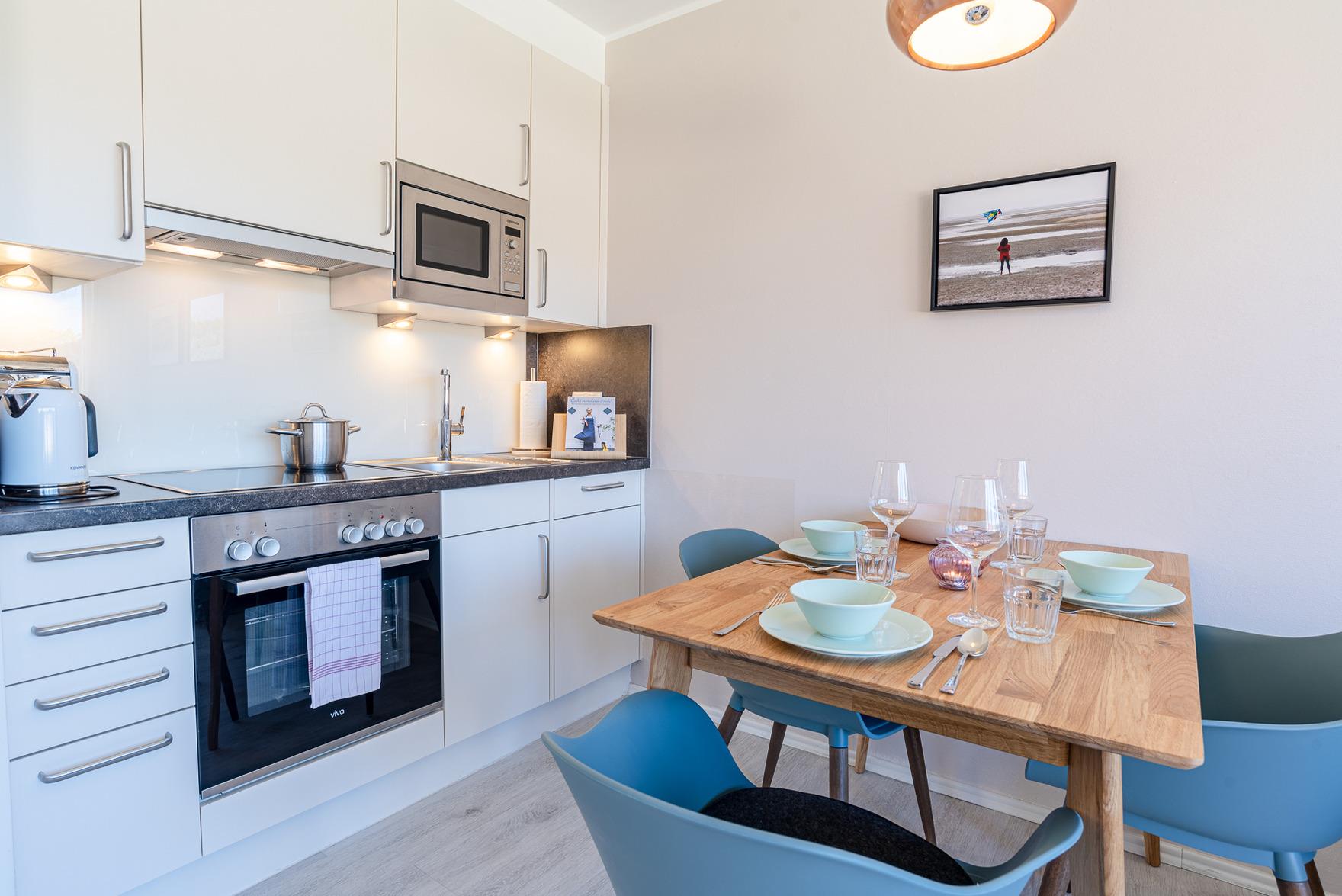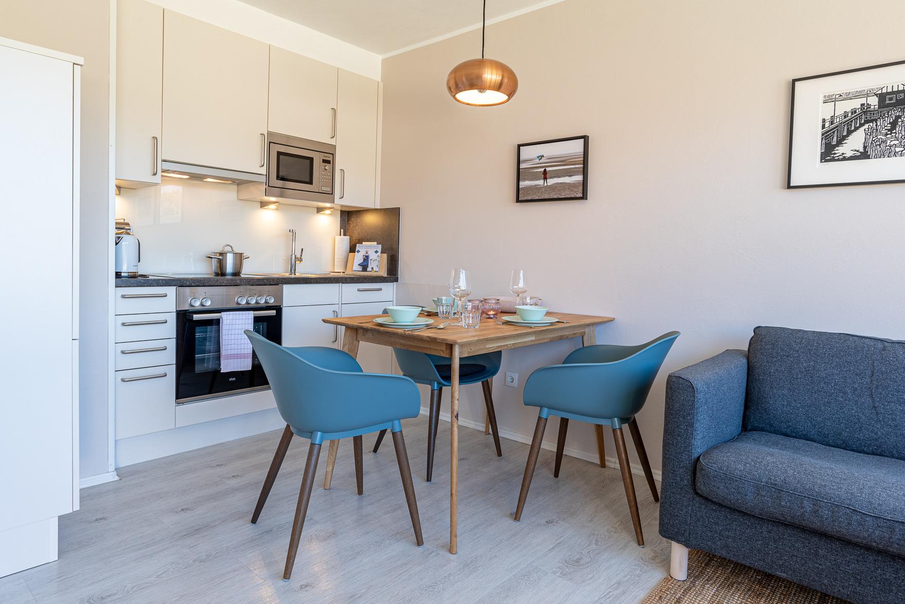 Die Wohnung befindet sich im Obergeschoss eines Mehrfamilienhauses in Wyk auf Föhr. Es erwartet Sie ein modernes und gemütlich eingerichtetes Feriendomizil für 2 Personen